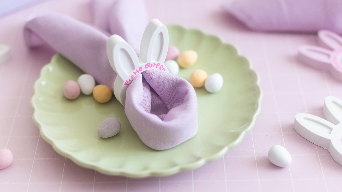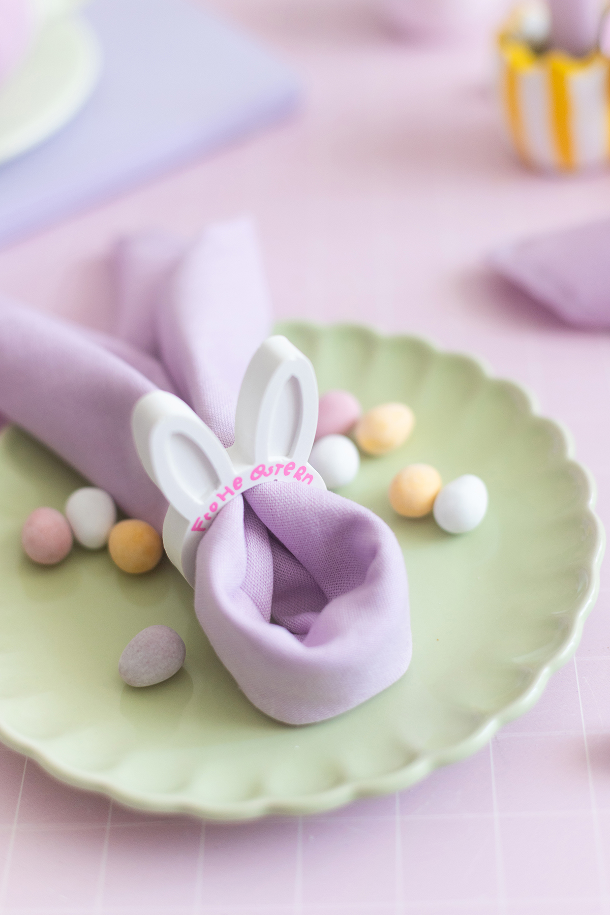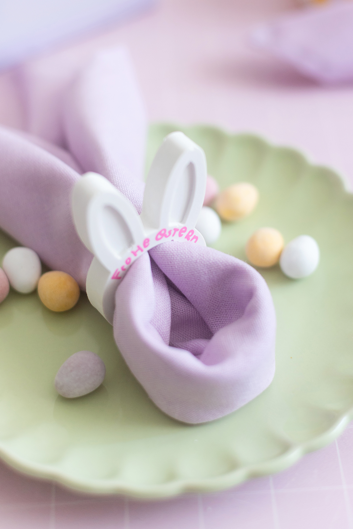 Du kannst die Serviettenringe auch mit Namen beschriften, und sie so als Platzkarten für die Ostertafel verwenden – und jeder kann sich sein Häschen mit nach Hause nehmen.