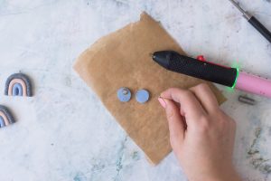 Im nächsten Schritt klebst du mithilfe von Heißkleber die Verschlüsse auf die Rückseite der FIMO-Kreise.