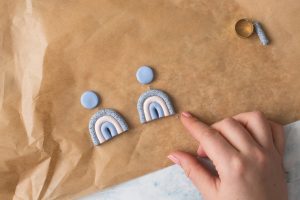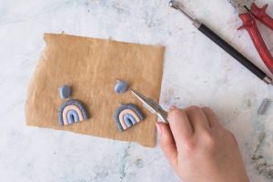 Jetzt kommen die Ohrringe bei 110 Grad für 30 Minuten in den Backofen zum Aushärten. Wenn die Ohrringe ausgehärtet sind, lass sie einen Moment abkühlen, bevor du weiter arbeitest.