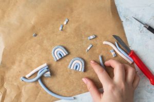 3. Drücke nun die drei Stränge aneinander und forme mit den Händen eine Regenbogen-Form aus den FIMO-Strängen – drücke dabei die Stränge gut zusammen, sodass sie aneinander haften.