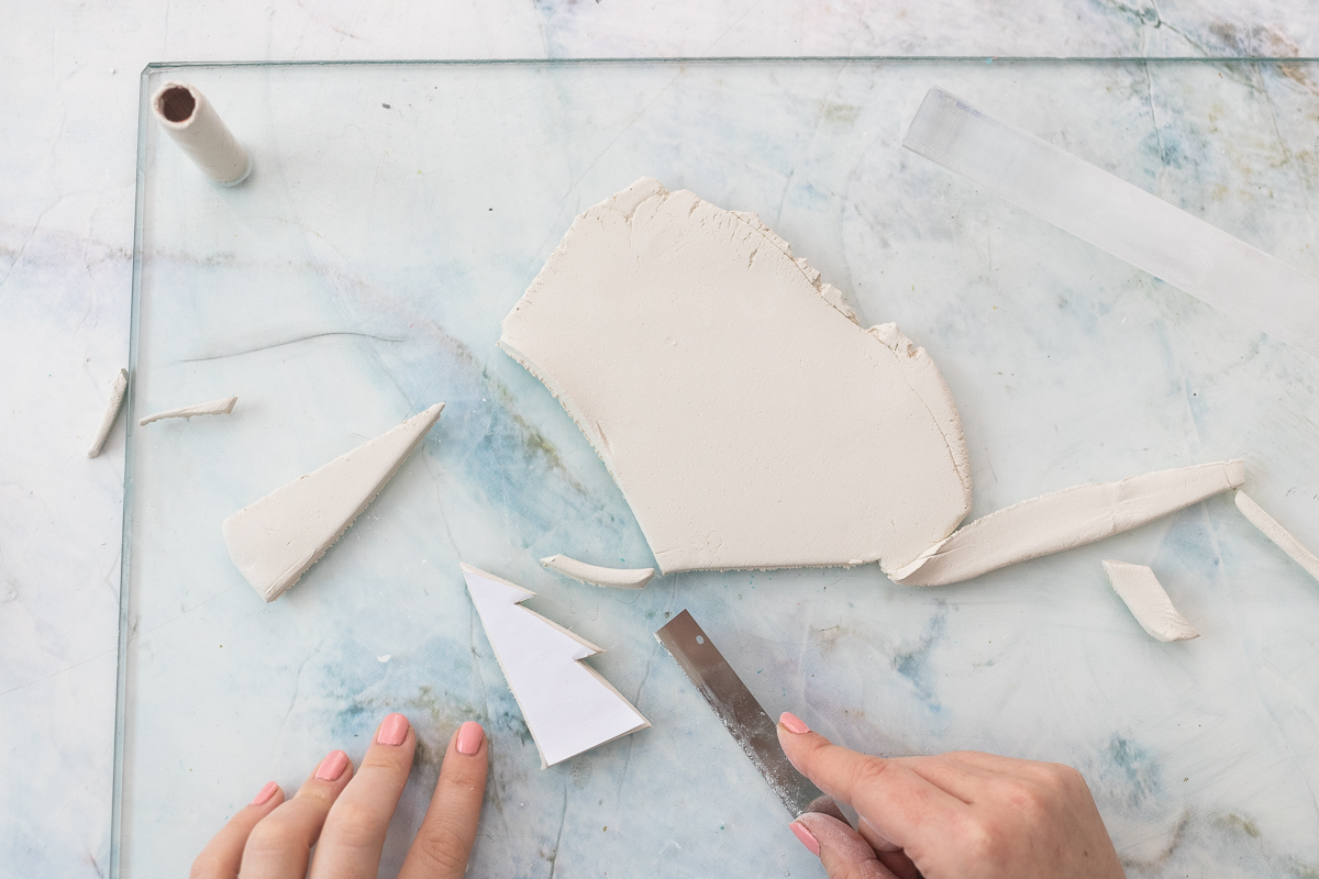 5. Nun kommt die große Platte zum Einsatz: Nutze die Vorlage und schneide aus der dicken Platte insgesamt 6 Tannenbäume mit dem Messer aus.