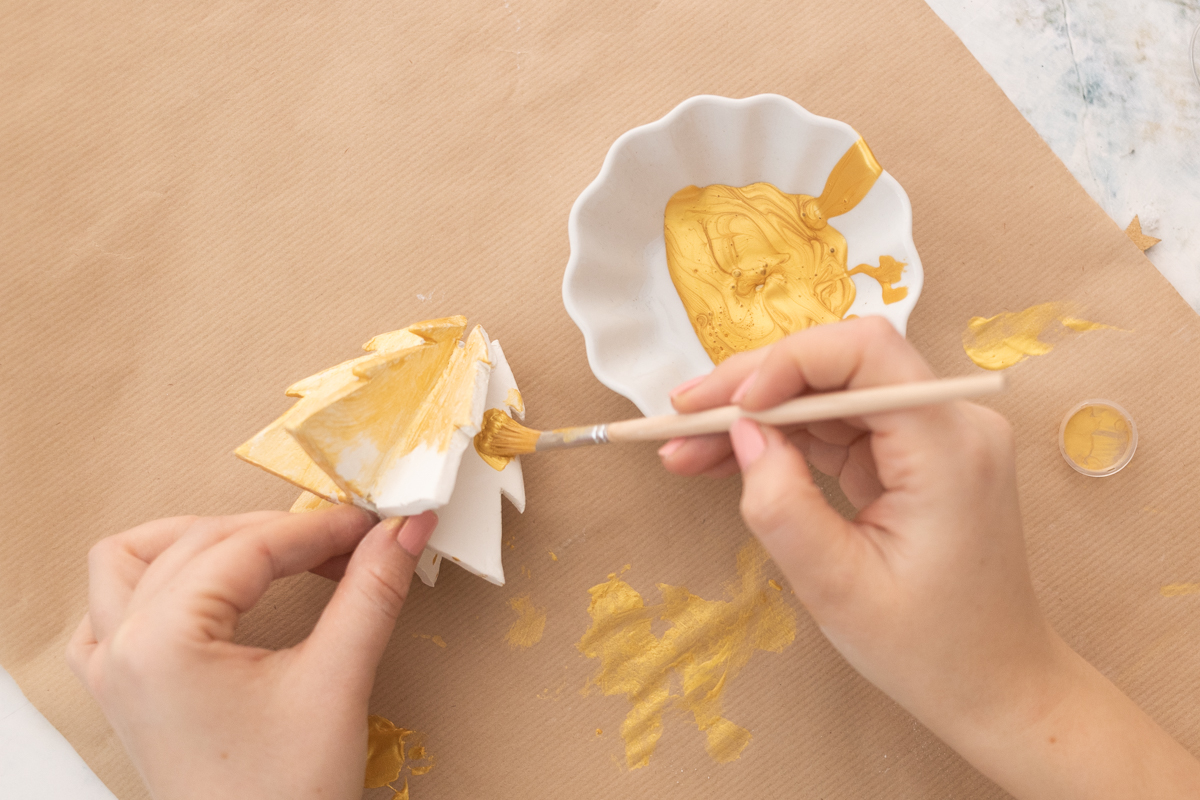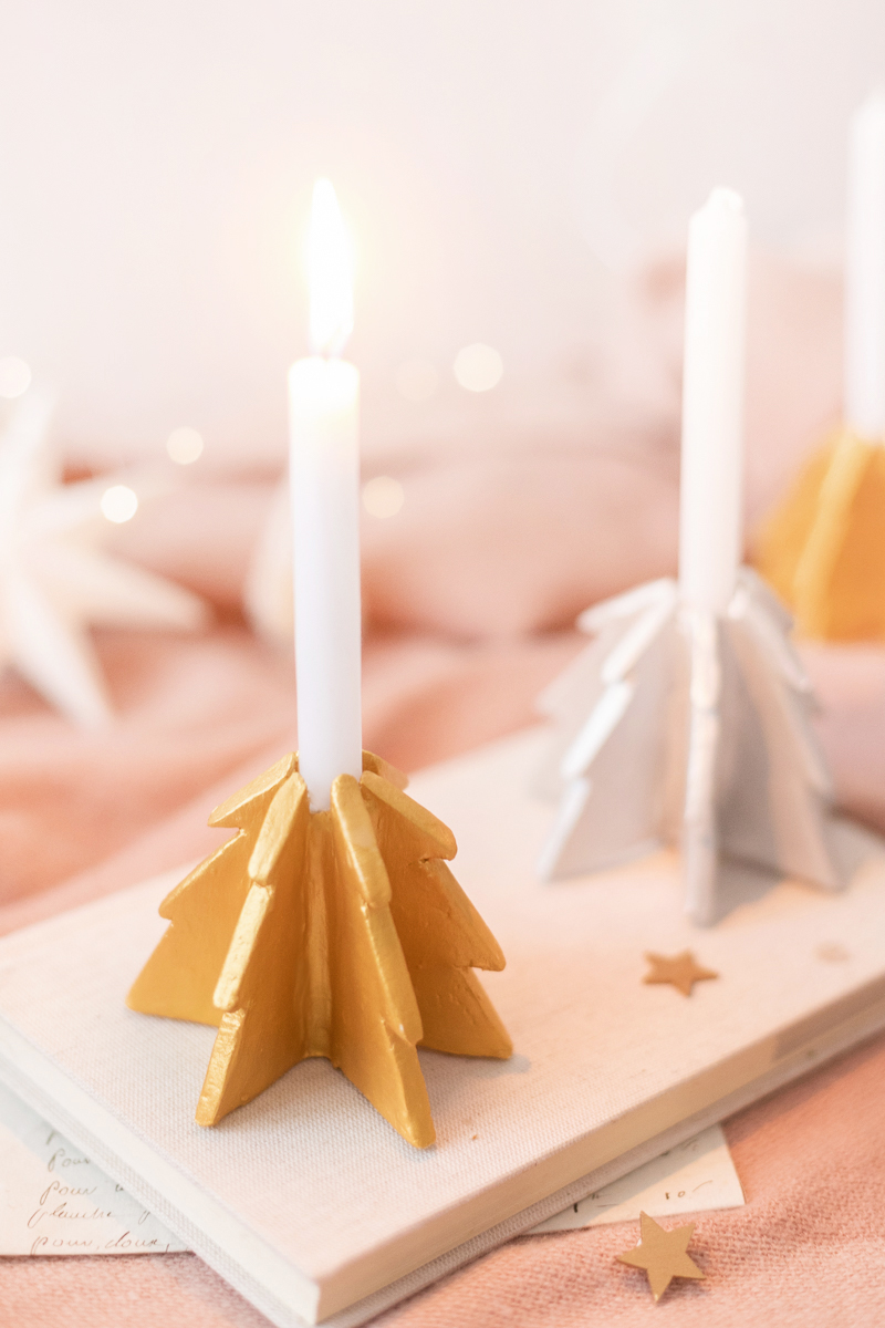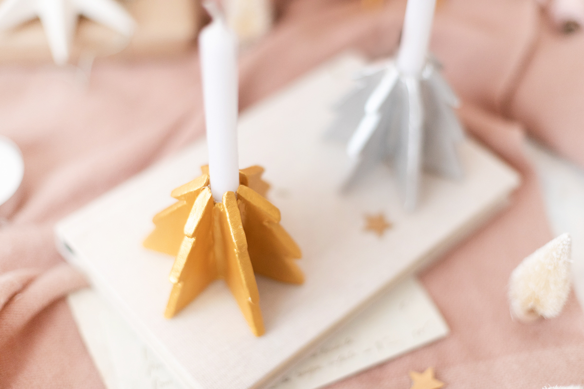 Ich habe aus Modelliermasse süße Tannen-Kerzenhalter gemacht. Die habe ich dann mit der Metallic-Farbe bemalt. Die sehen doch sooo chic aus, oder?