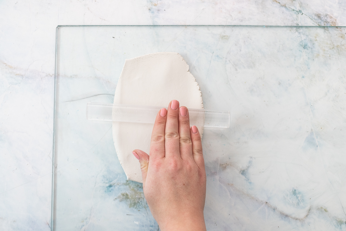 3. Rolle mit dem Acrylroller die Modelliermasse aus. Du brauchst eine größere Platte, die ca. 5mm dick ist, und eine kleinere Platte, die ca 1 mm dick ist.