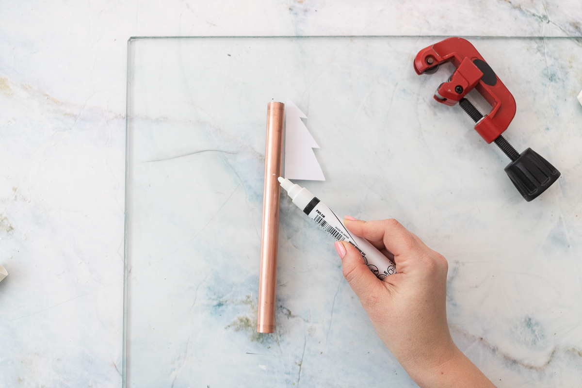 Lege die Vorlage an das Rohr an. Markiere den unteren Rand der Vorlage.