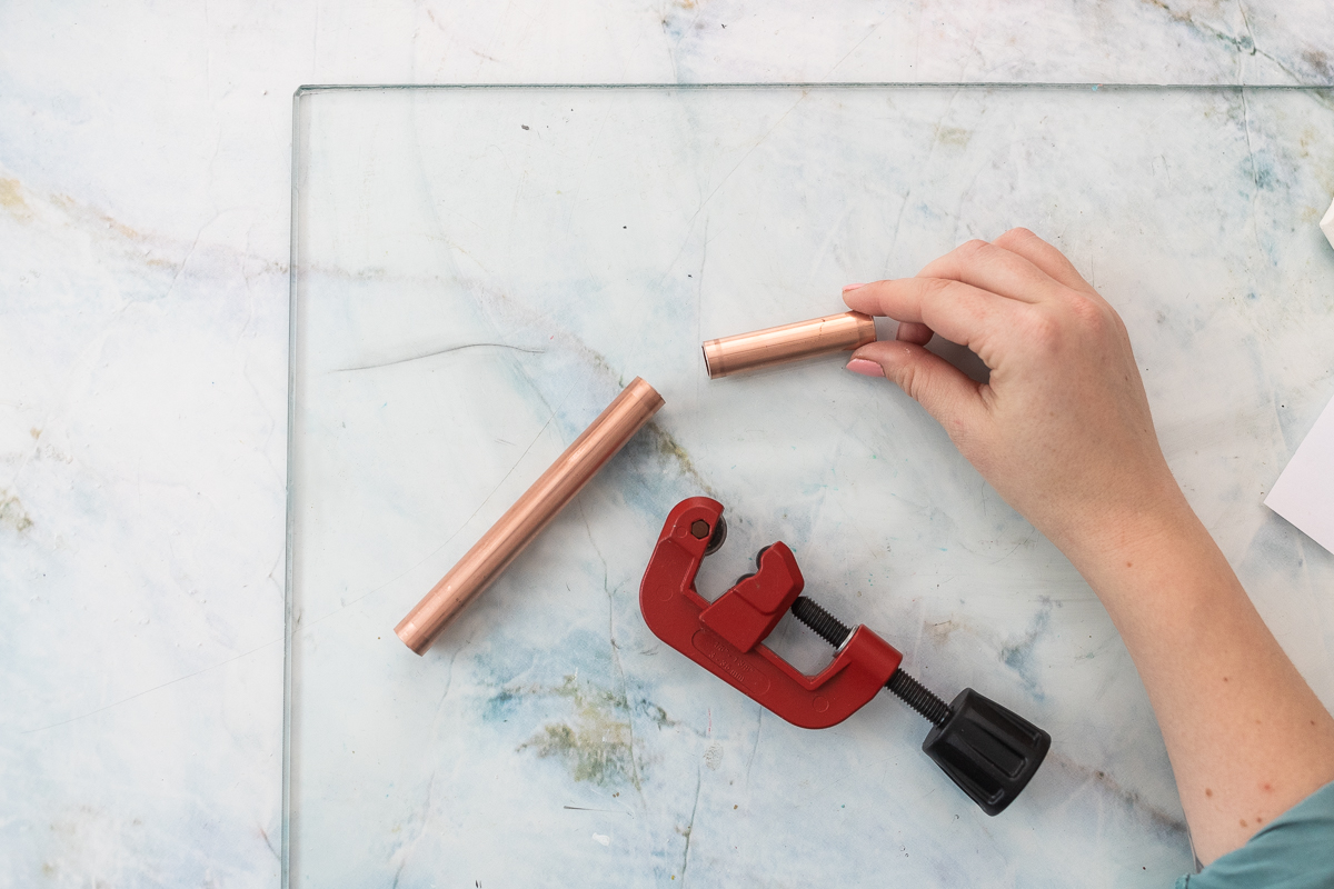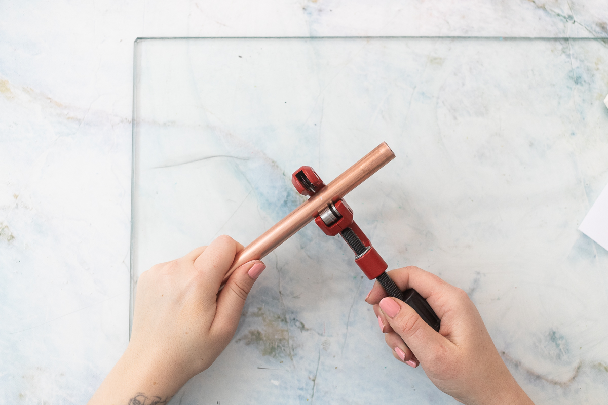 2. Lege den Rohrschneider an dieser markierten Stelle an. Nutze den Rohrschneider, um das Rohr auf die entsprechende Länge zu kürzen.