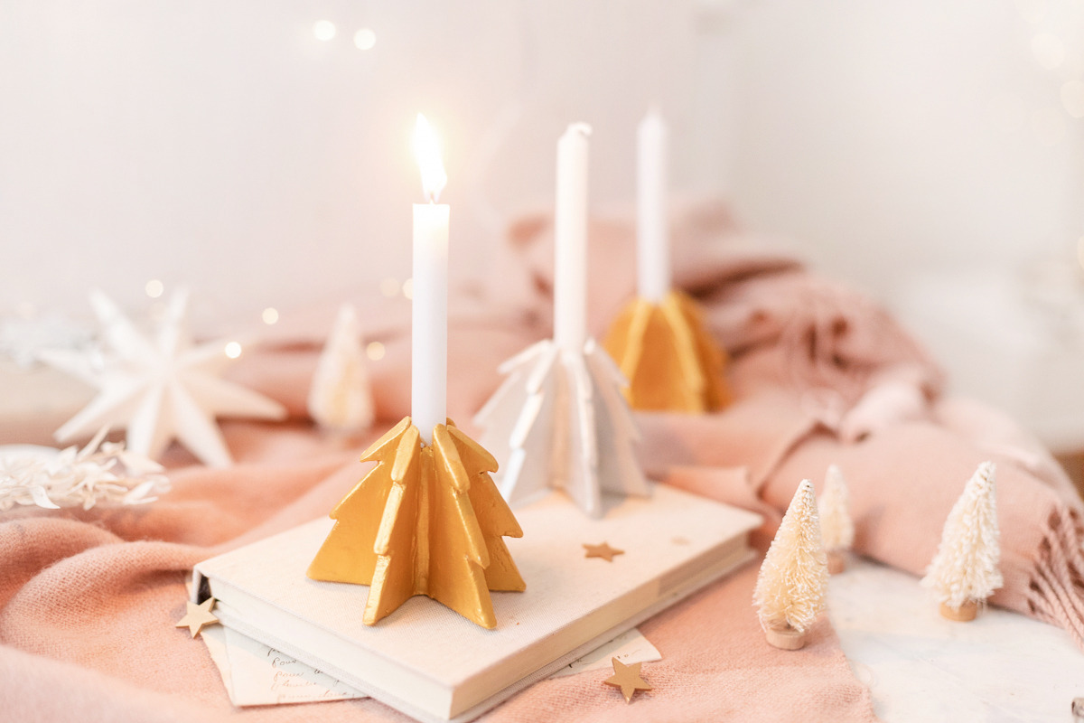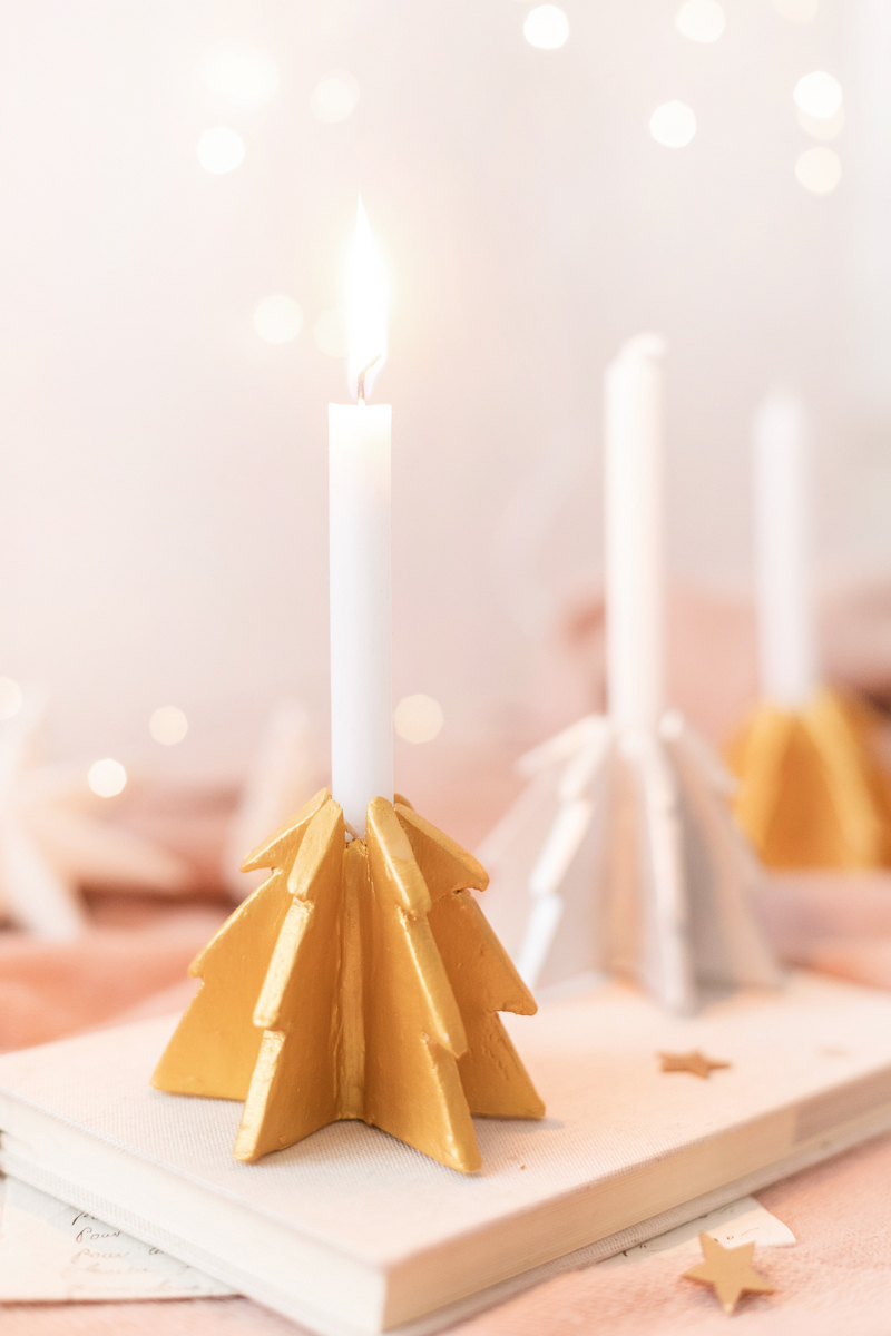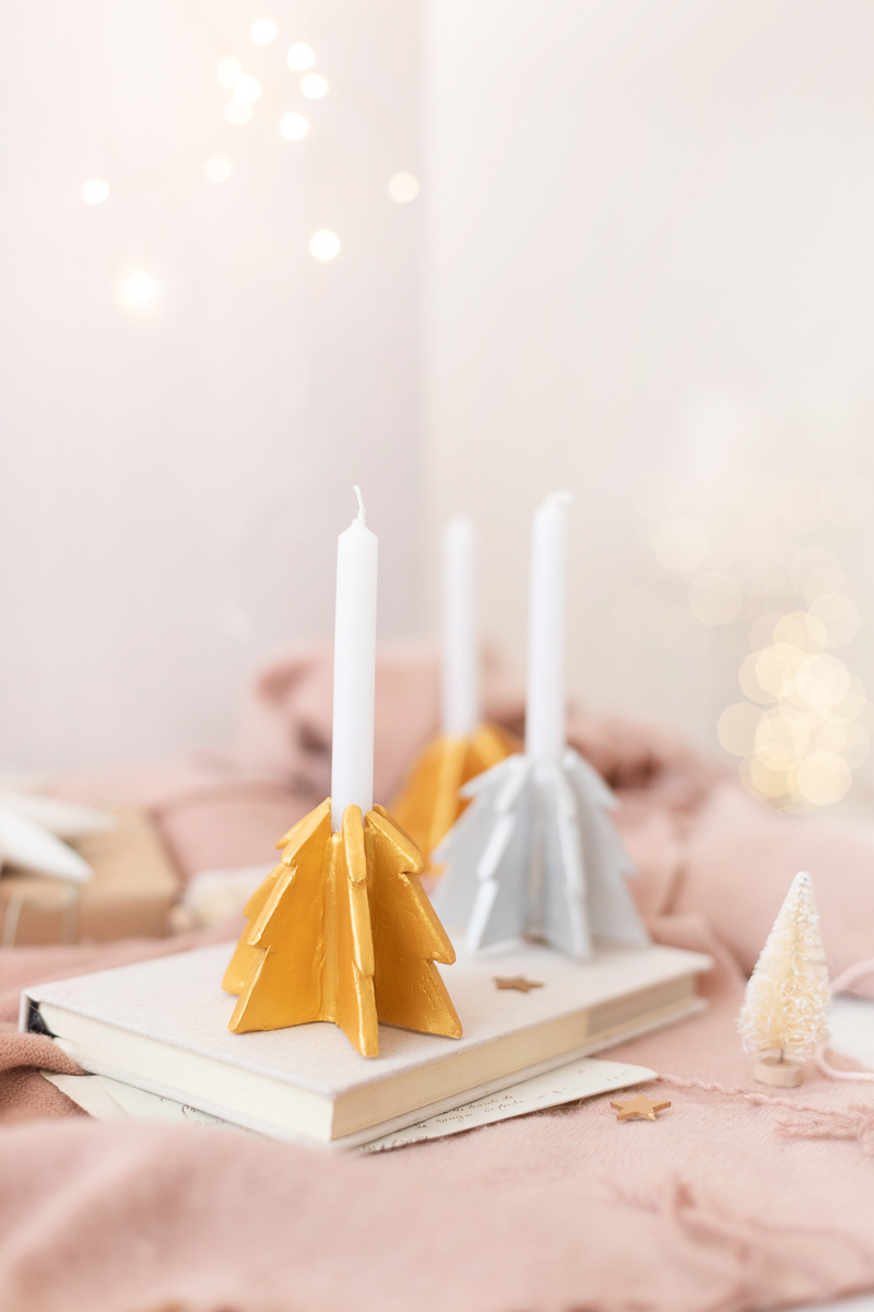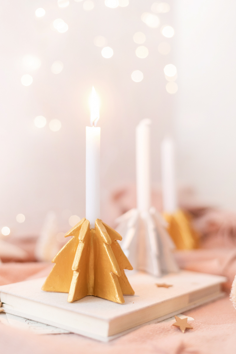 Lass die Farbe gut trocknen – und fertig ist dein wunderschöner DIY Kerzenständer aus Modelliermasse! Von oben kannst du dann kleine Baumkerzen in die Kerzenhalter stecken.