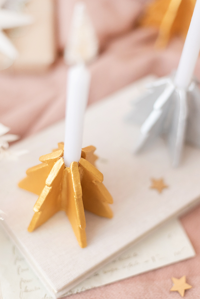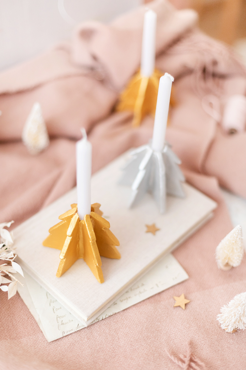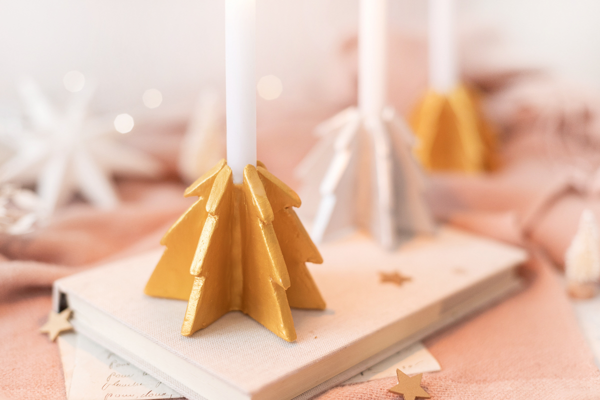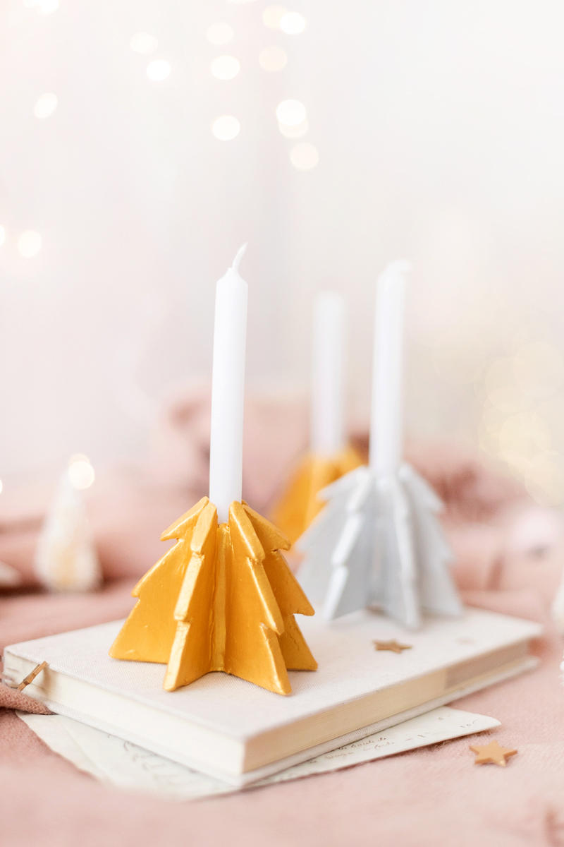 Lass die Farbe gut trocknen – und fertig ist dein wunderschöner DIY Kerzenständer aus Modelliermasse! Von oben kannst du dann kleine Baumkerzen in die Kerzenhalter stecken.