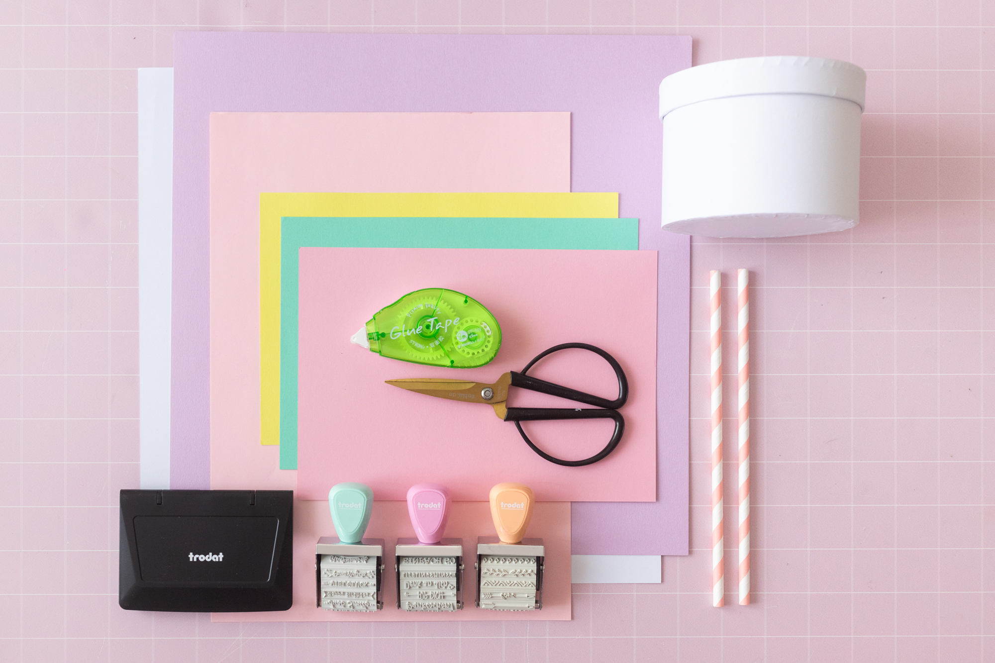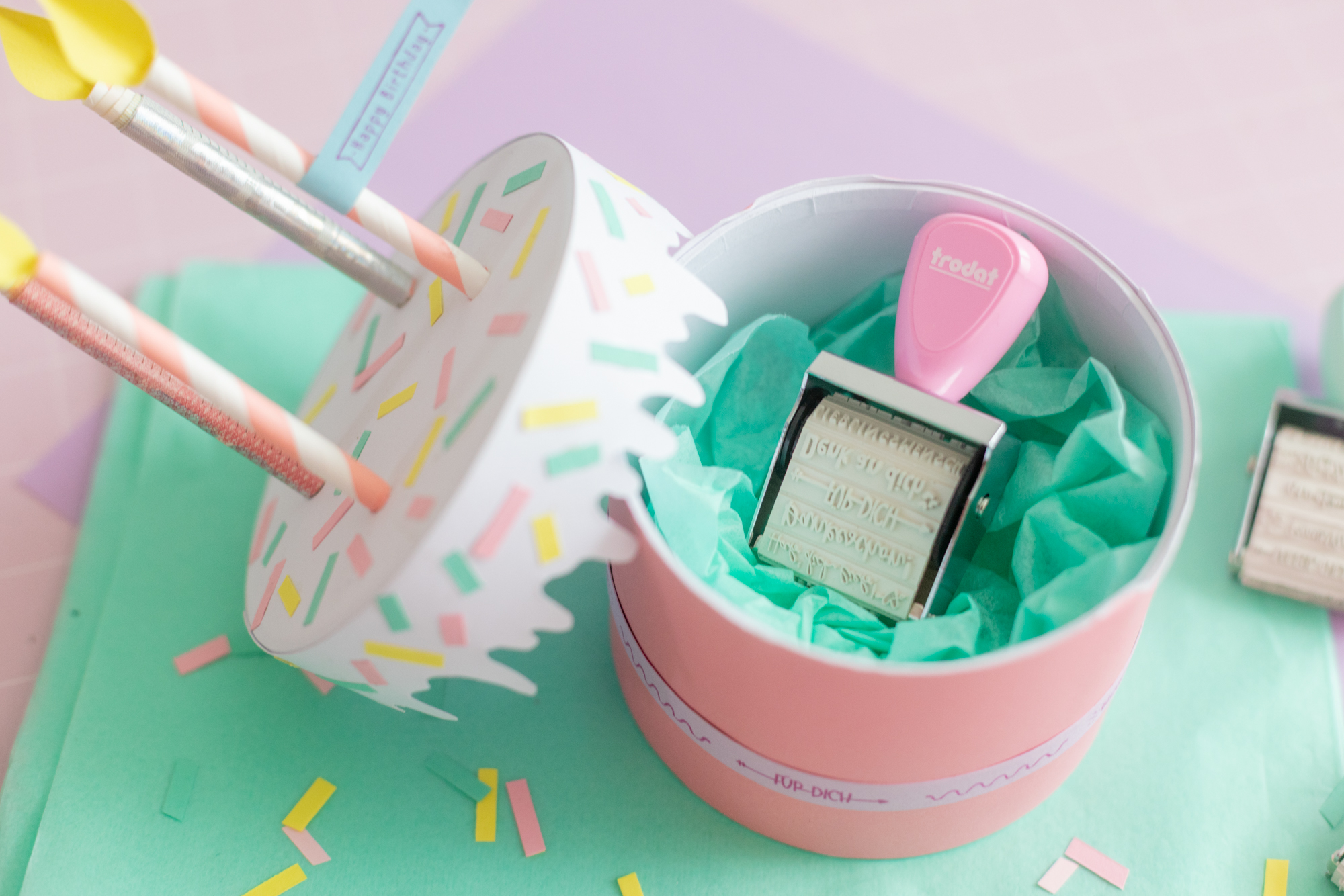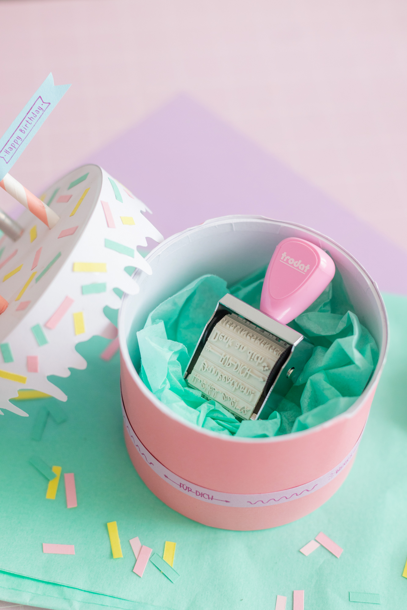 Passend zum Thema habe ich mir eine süße kleine Idee für ein kreatives Geldgeschenk überlegt: eine tolle Geldgeschenk-Torte, die ich aus einer Pappbox gebastelt habe. Die Torte habe ich mit den Creative Mini Stempeln von trodat verschönert.