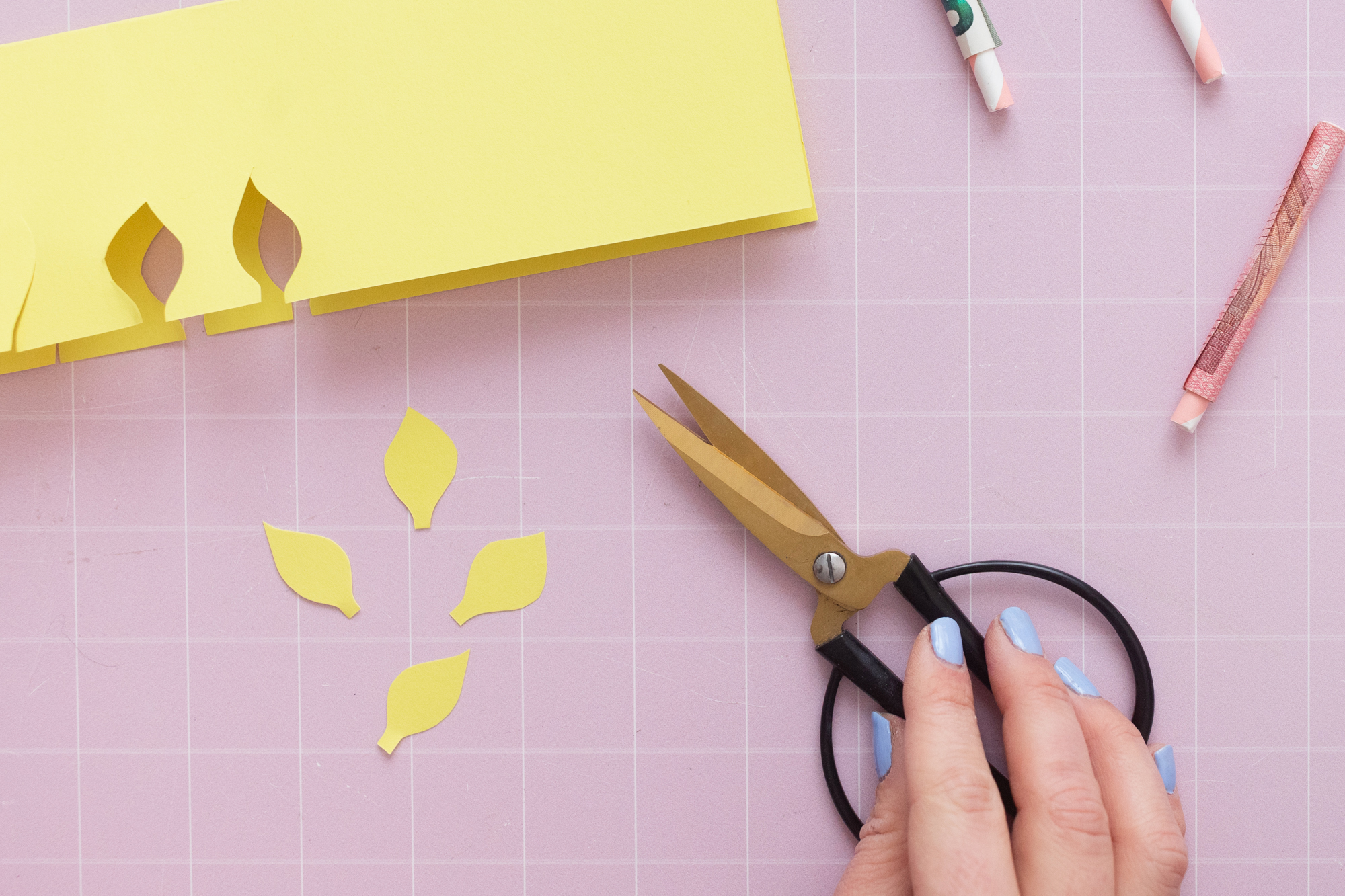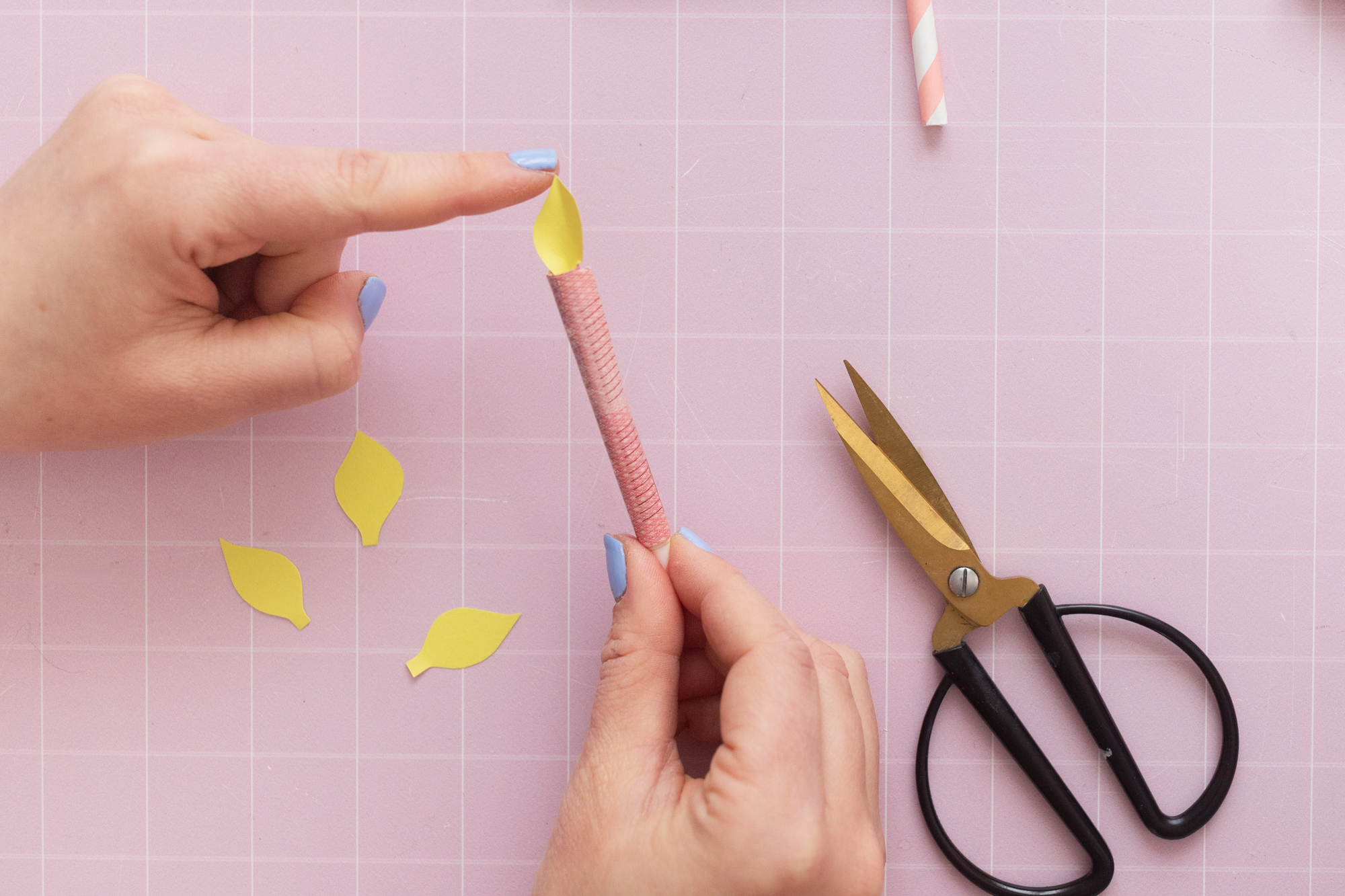 Jetzt schneidest du mit der Schere vier kleine Tropfen aus gelbem Papier zu. Das sind die Flammen der Kerzen. Diese steckst du in jeweils einen Strohhalm. Du kannst sie mit einem Klebepunkt fixieren.
