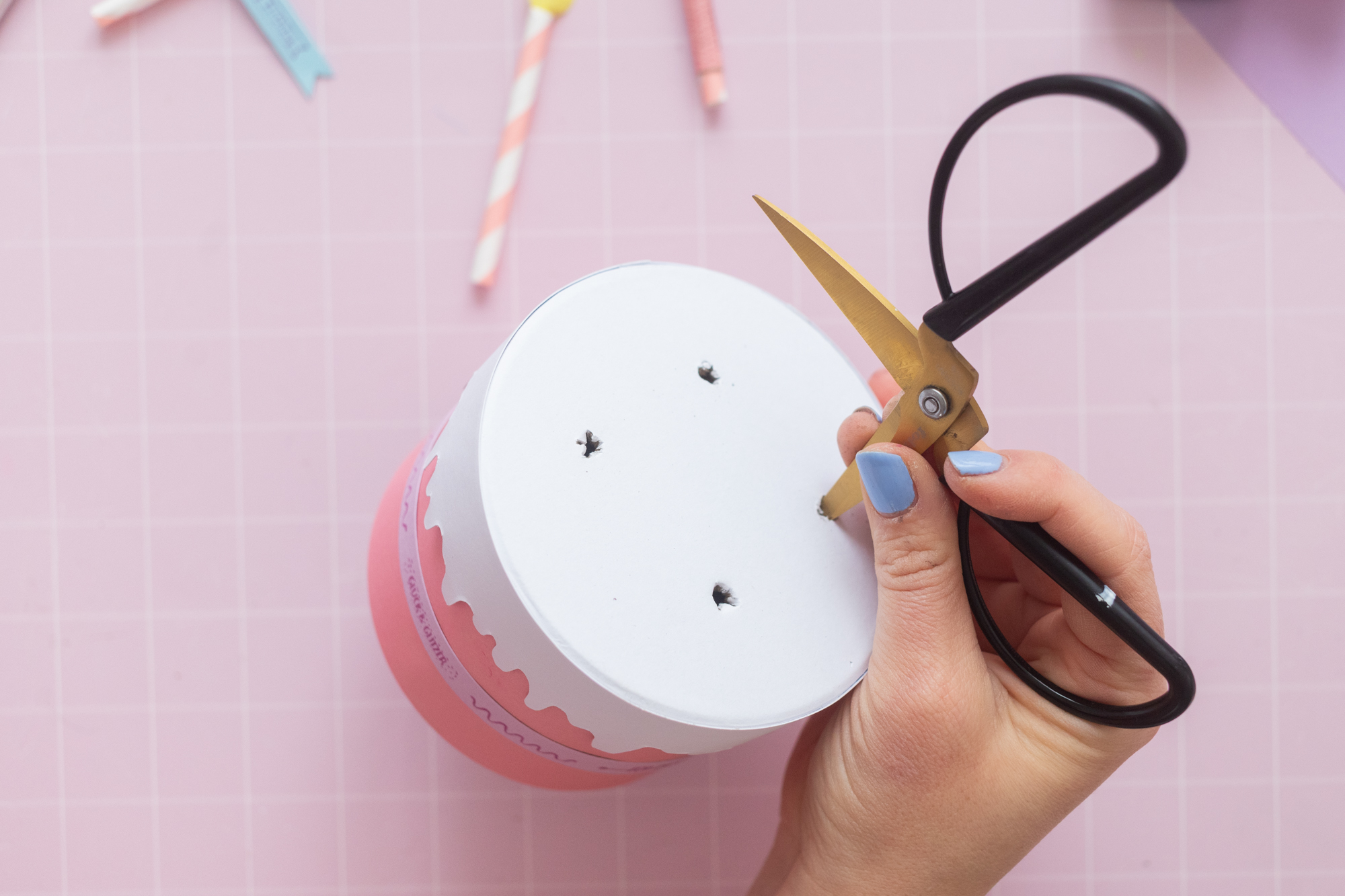 Mache mit der Schere nun Löcher in den Deckel der Pappbox – je nachdem, wie viele „Kerzen“ du benutzen willst.