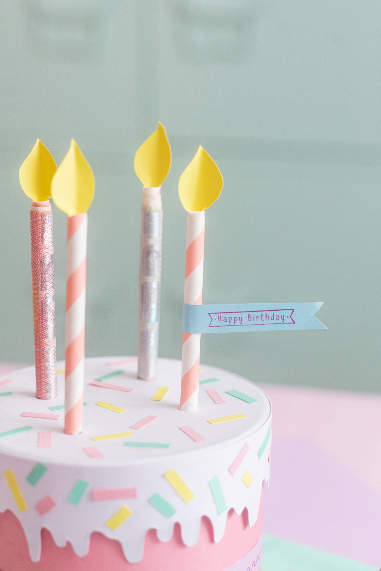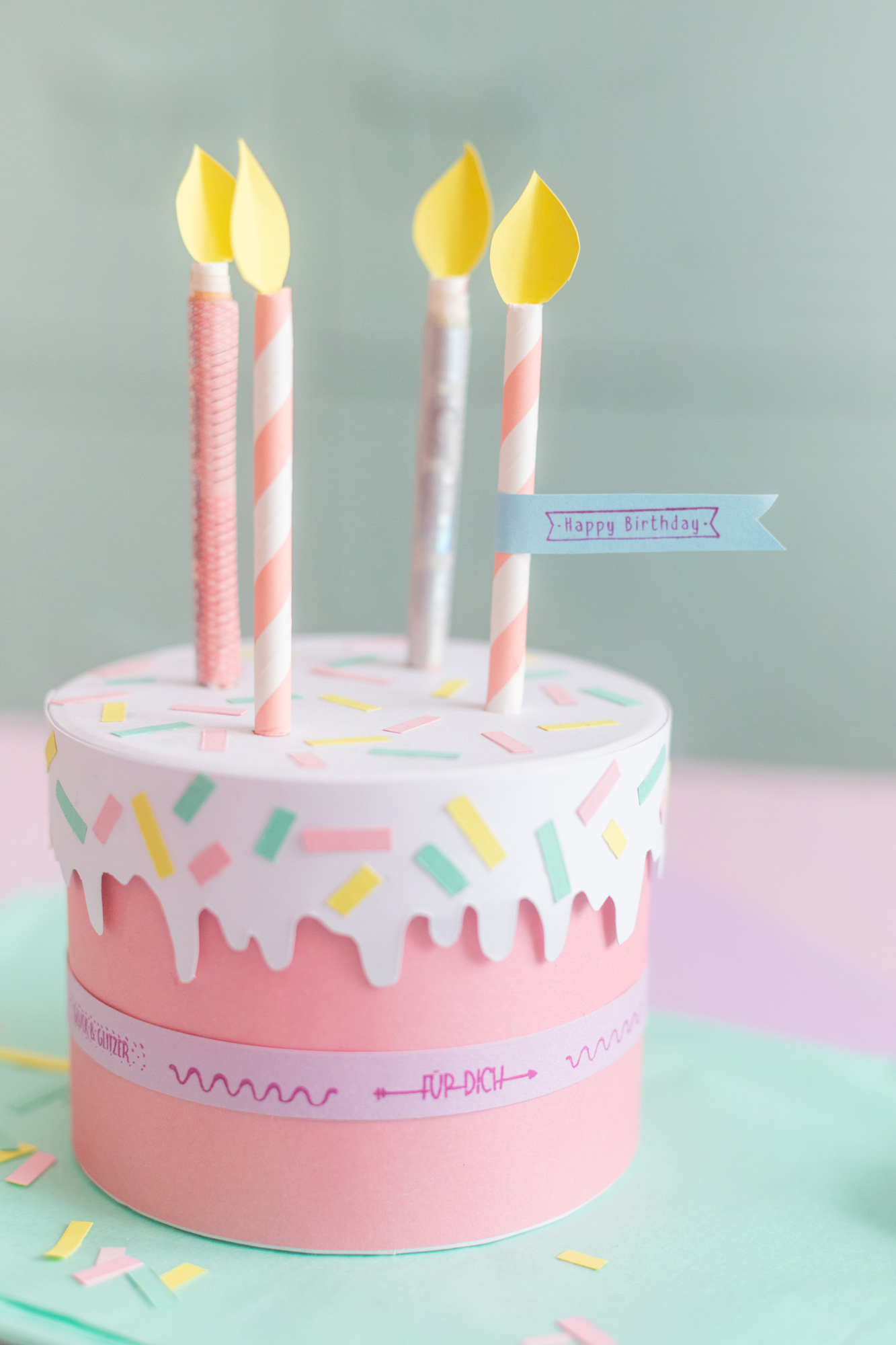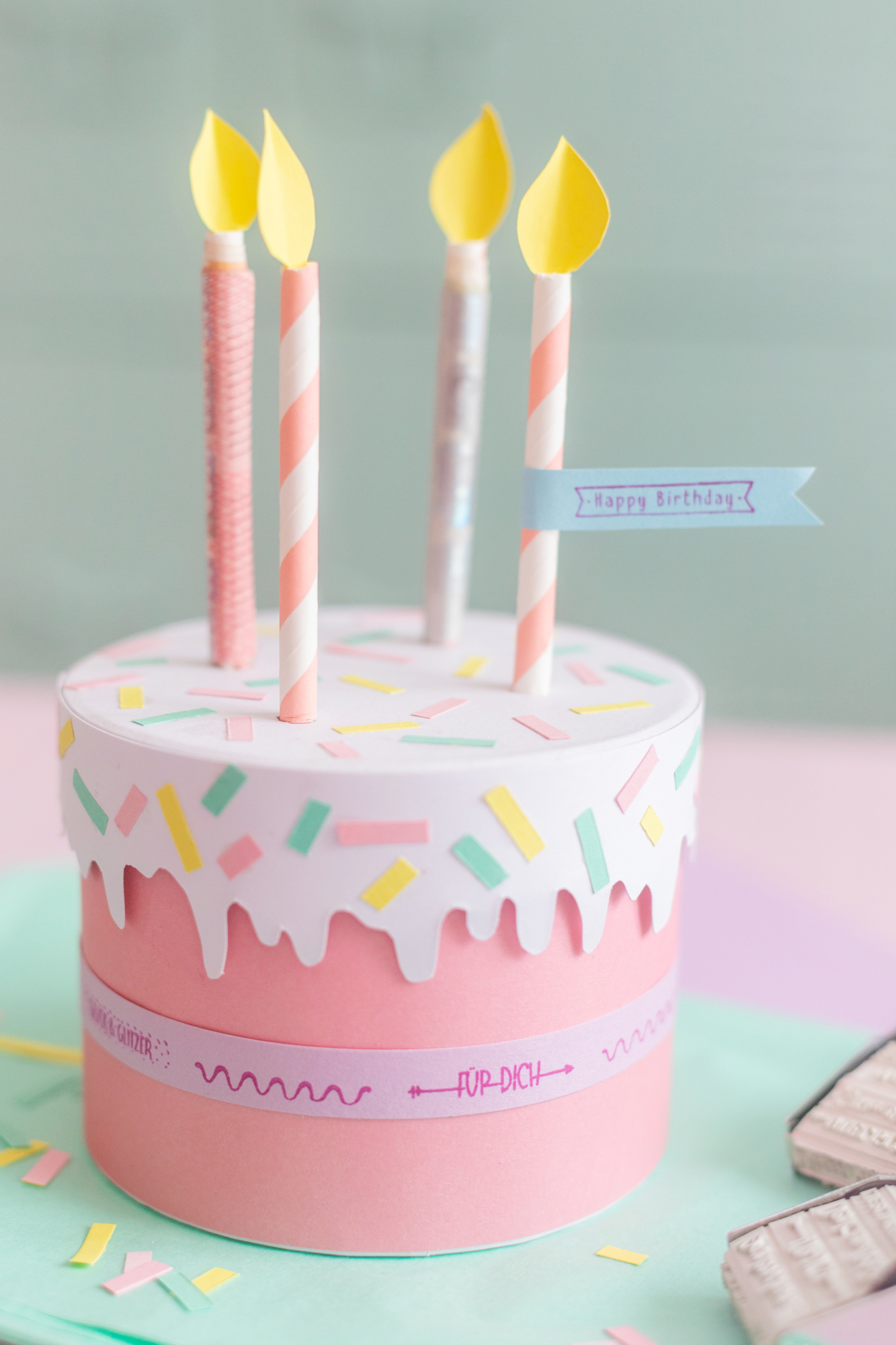 Stecke die Geldkerzen nun in den Deckel der Pappbox – sie halten von allein oder können mit etwas Kleber fixiert werden. Schon sieht deine Torte richtig festlich aus!