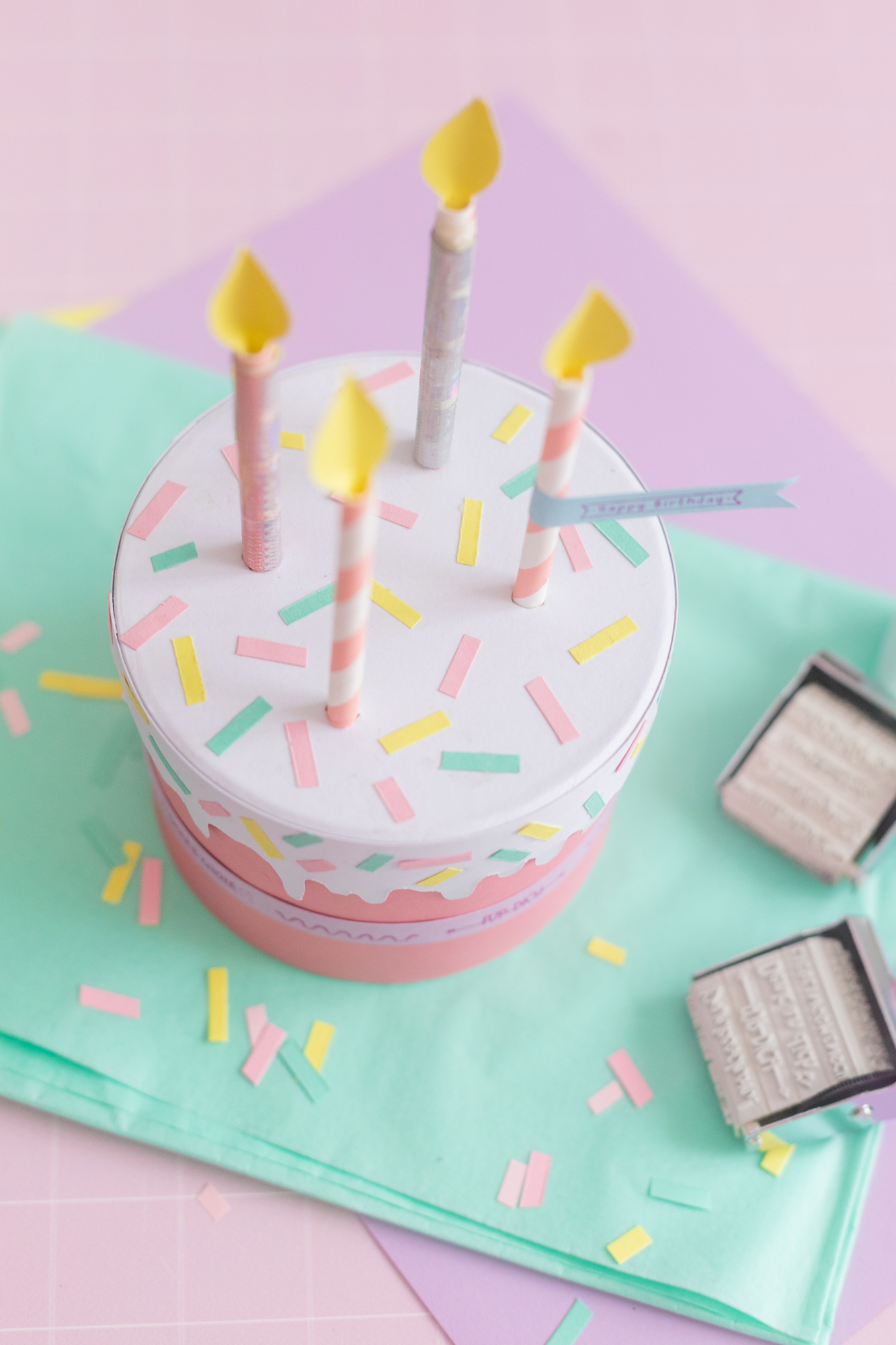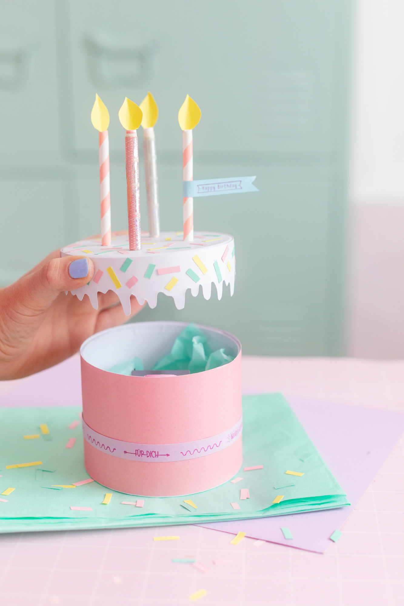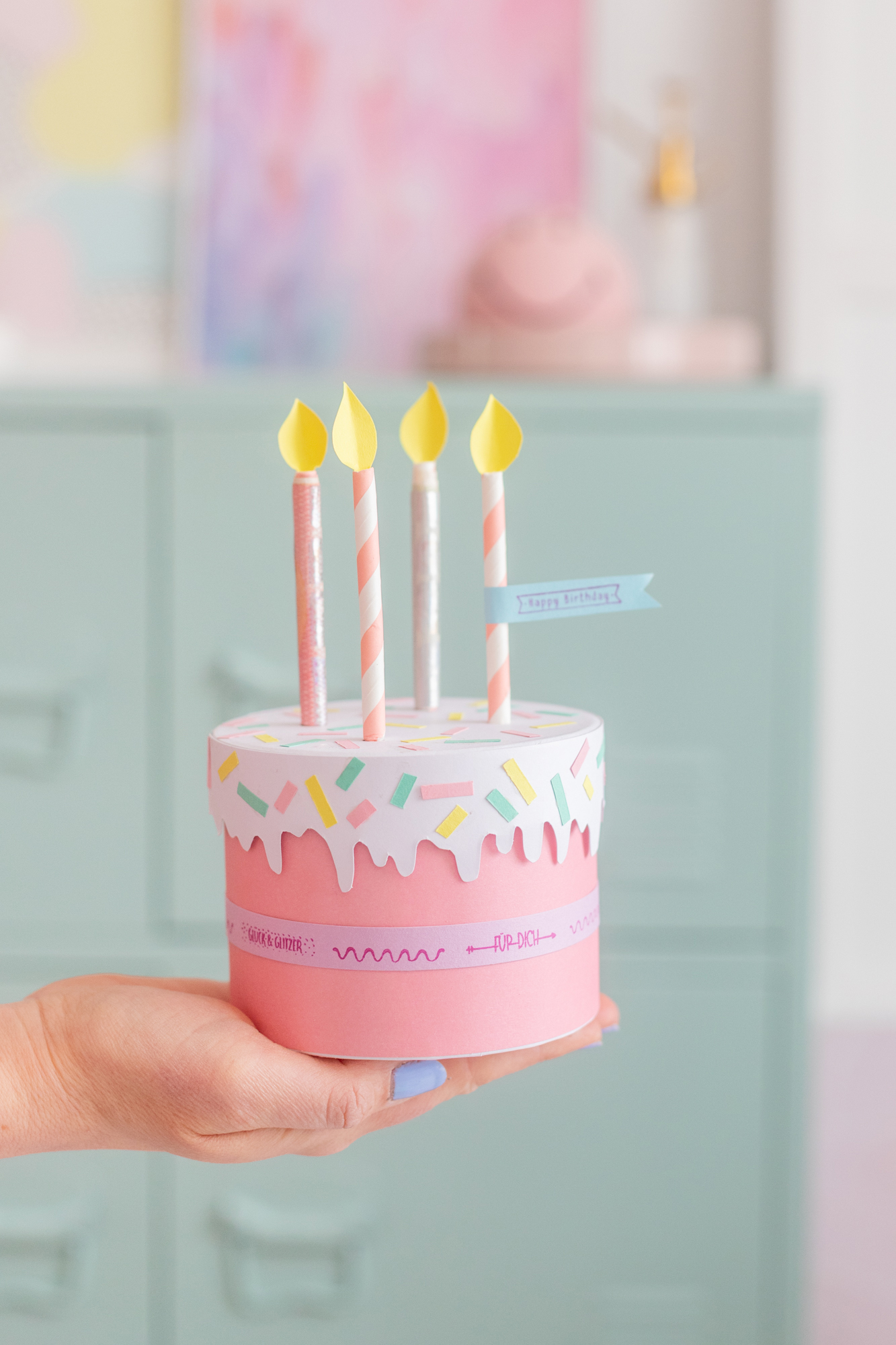 Stecke die Geldkerzen nun in den Deckel der Pappbox – sie halten von allein oder können mit etwas Kleber fixiert werden. Schon sieht deine Torte richtig festlich aus!