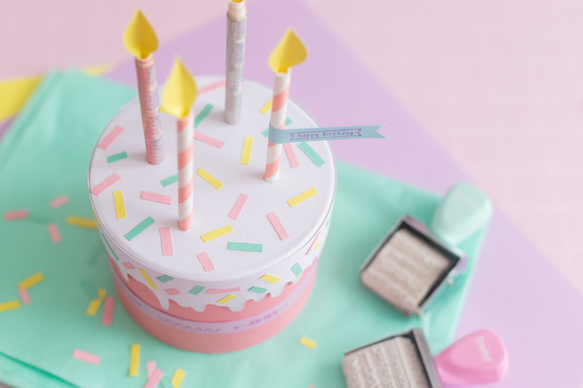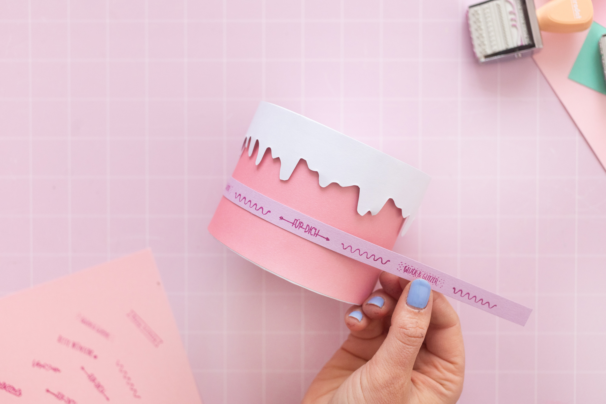 Die Pappbox dient als Basis für deine Torte. Beklebe sie rundherum mit farbigem Papier deiner Wahl. Ich habe mich für rosa entschieden.