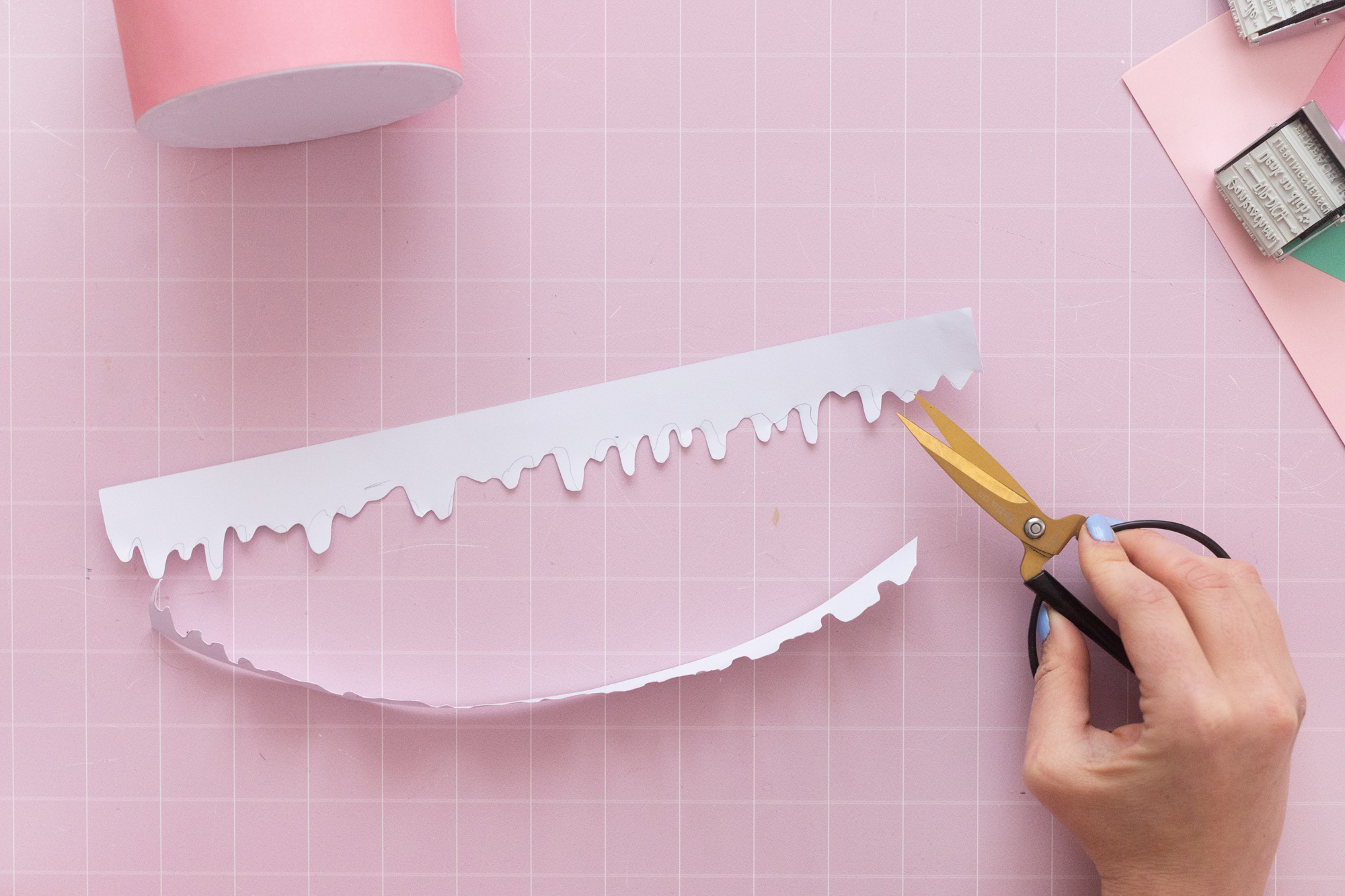 Als nächstes schneidest du aus Papier den Zuckerguss für den Deckel zu. Achte darauf, dass das Papier lang genug ist, dass das Papier einmal um den Deckel passt. Du kannst hier freihand einen Tropfen-Effekt mit dem Bleistift vorzeichnen oder direkt los schneiden.