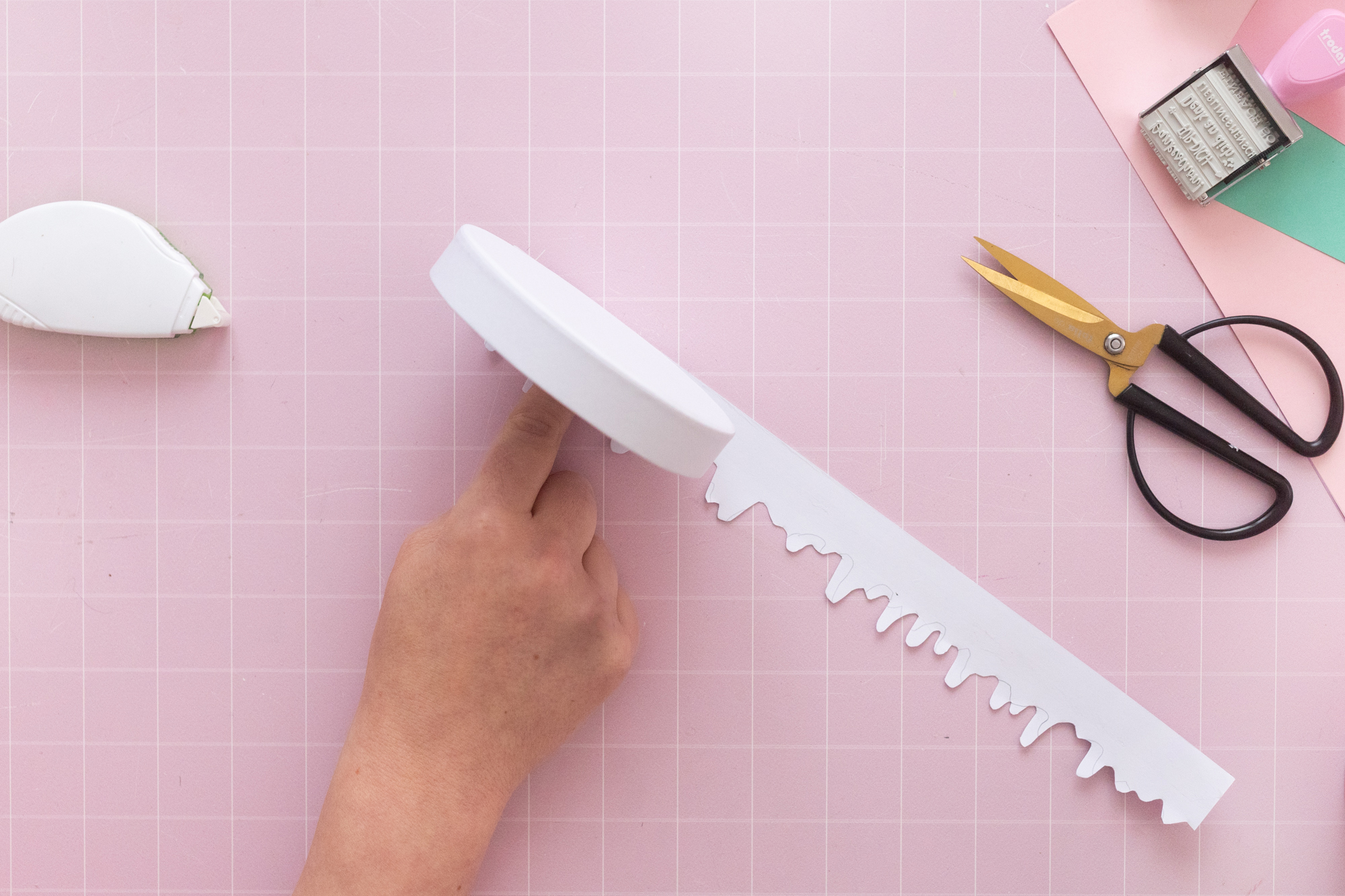 Der Zuckerguss aus weißem Papier wird dann rundherum um den Deckel der Box geklebt.