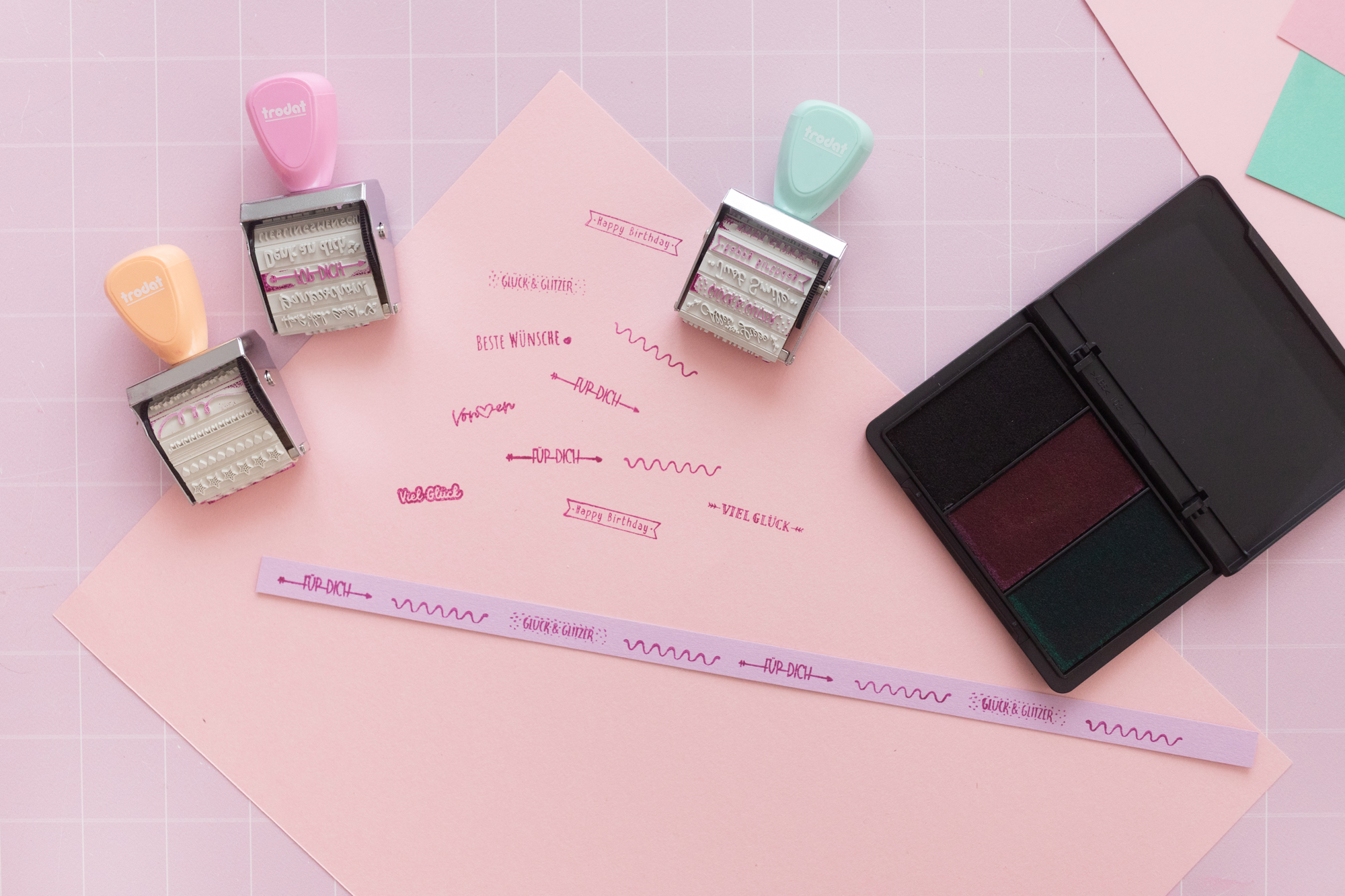 Nun schneidest du aus einem bunten Papier eine Banderole (1 – 2 cm) zu, die ebenfalls einmal um die Box passt. Die Banderole kannst du dann mit dem Creative Mini von trodat verschönern. Ich habe verschiedene Motive abgewechselt, die gut zum Thema „Schenken“ passen.