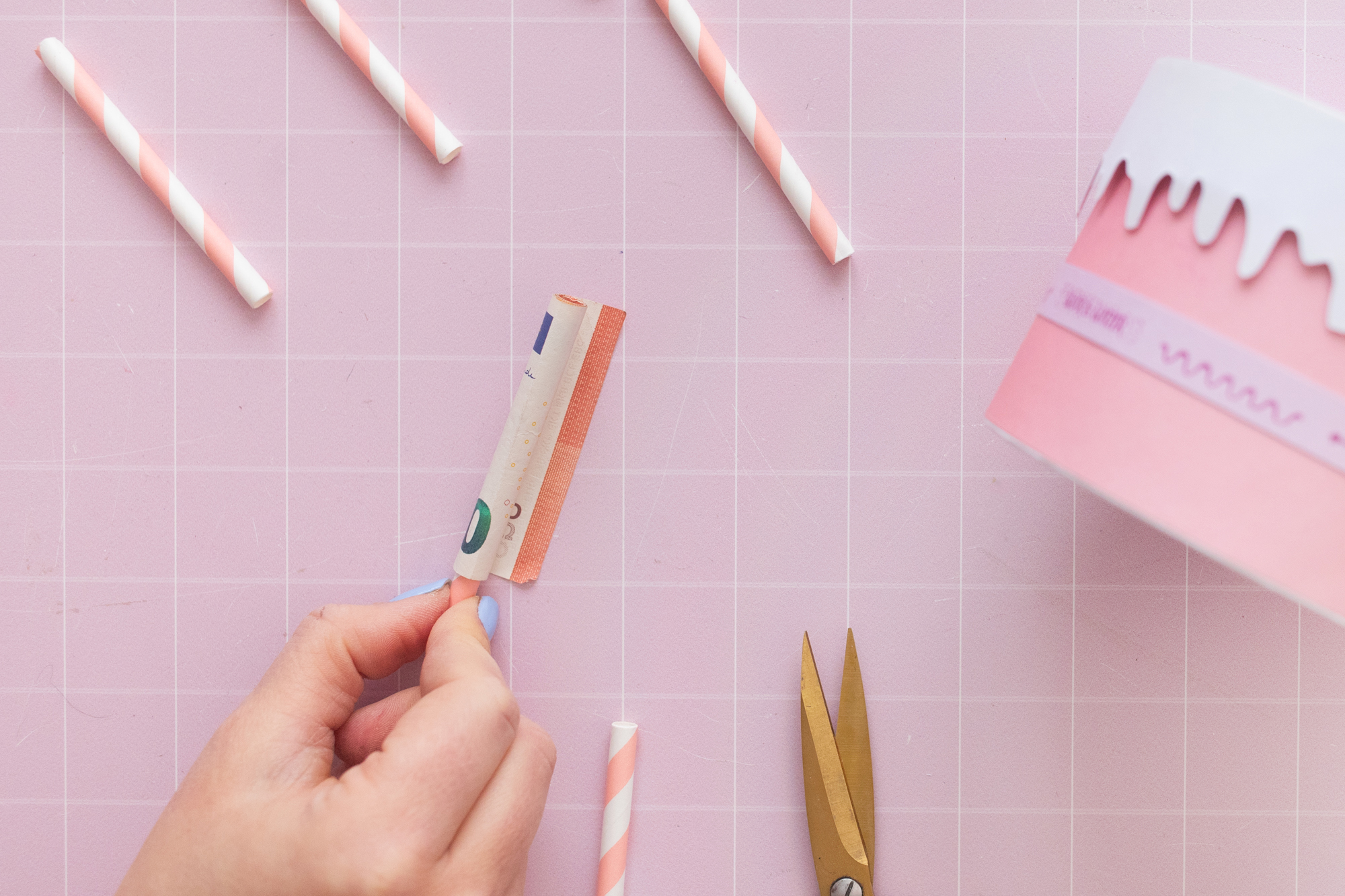 Ich habe zwei von vier Strohhalmen mit Geldscheinen eingewickelt – du kannst das Geschenk aber natürlich auch ganz ohne Geld umsetzen, und die Torte nur als Verpackung verwenden.