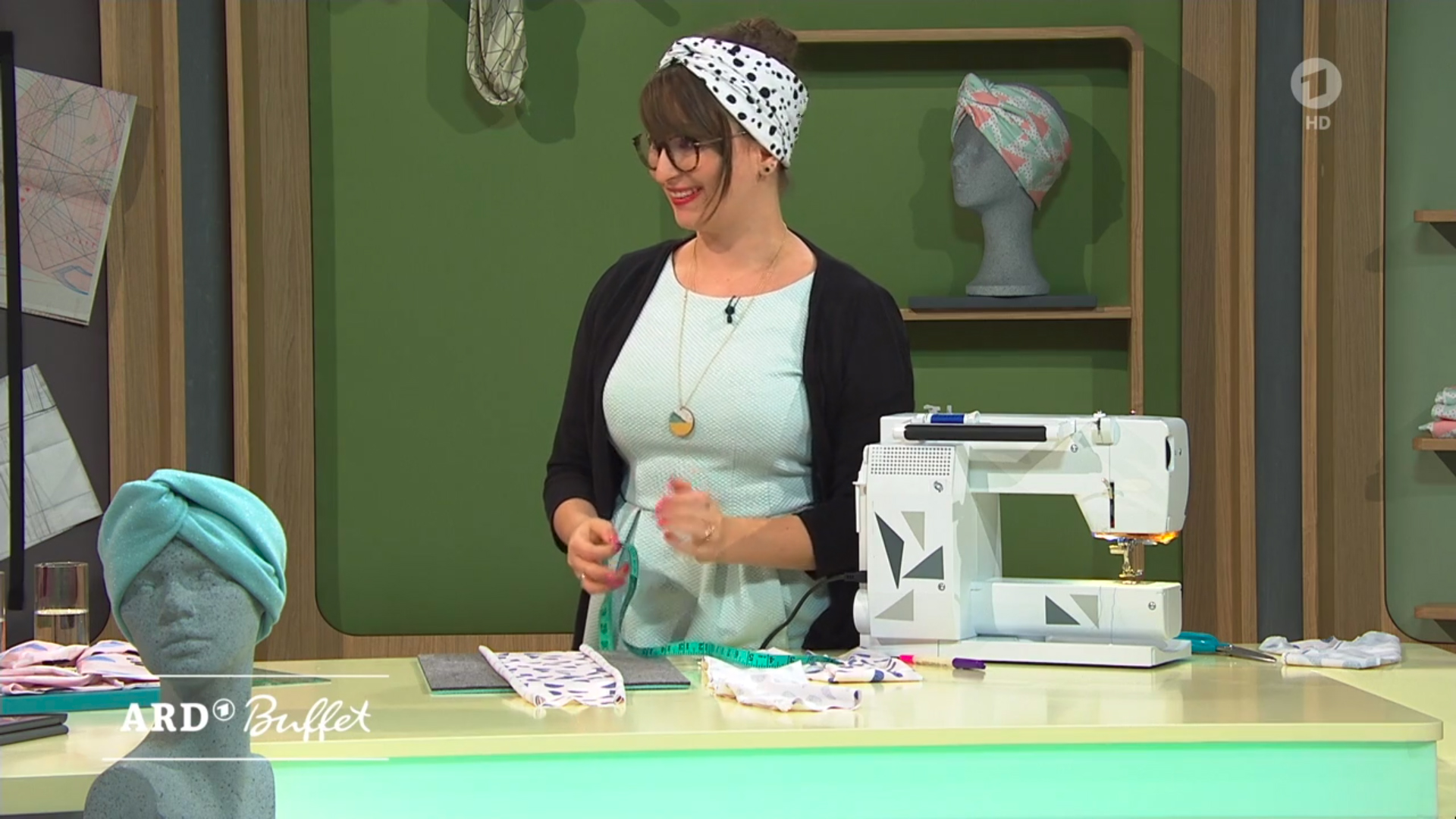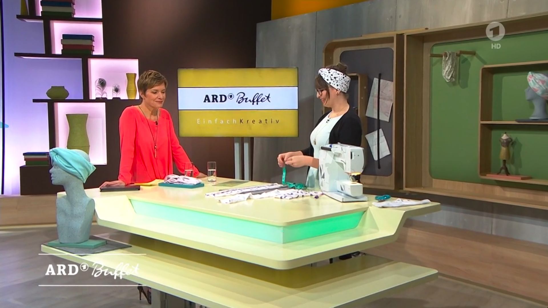 Spannend: Das ARD-Buffet hat ein neues Studio, in dem seit gestern gesendet wird. Entsprechend ungewohnt sehen auch die Screenshots aus! Was ich cool finde, ist das Regal im Hintergrund des DIY-Bereichs, in dem man die DIYs drapieren kann. Wenn ihr genau hinschaut, seht ihr nämlich hinten noch mal Köpfe mit weiteren Stirnbändern.