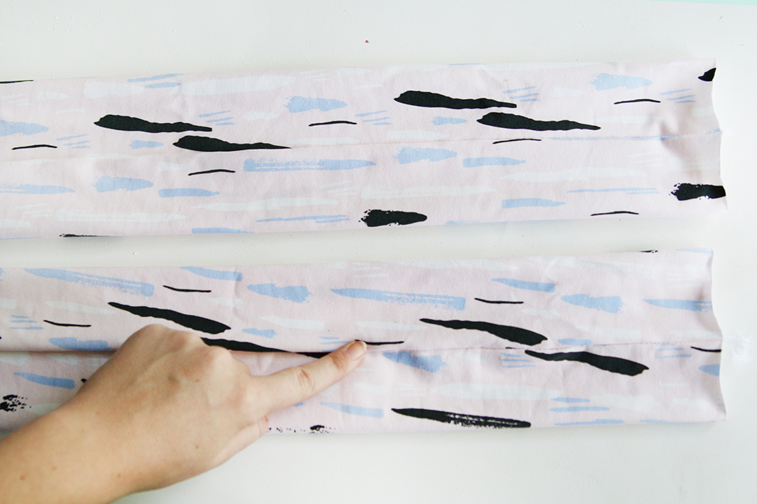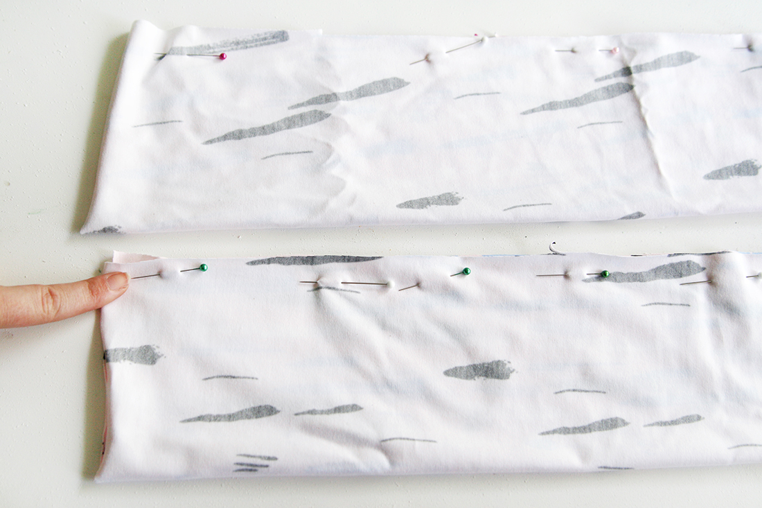 2. Klappe die Rechtecke entlang der langen Seite rechts auf rechts, sodass die linke Seite außen liegt. Stecke die Schnittkanten zusammen.