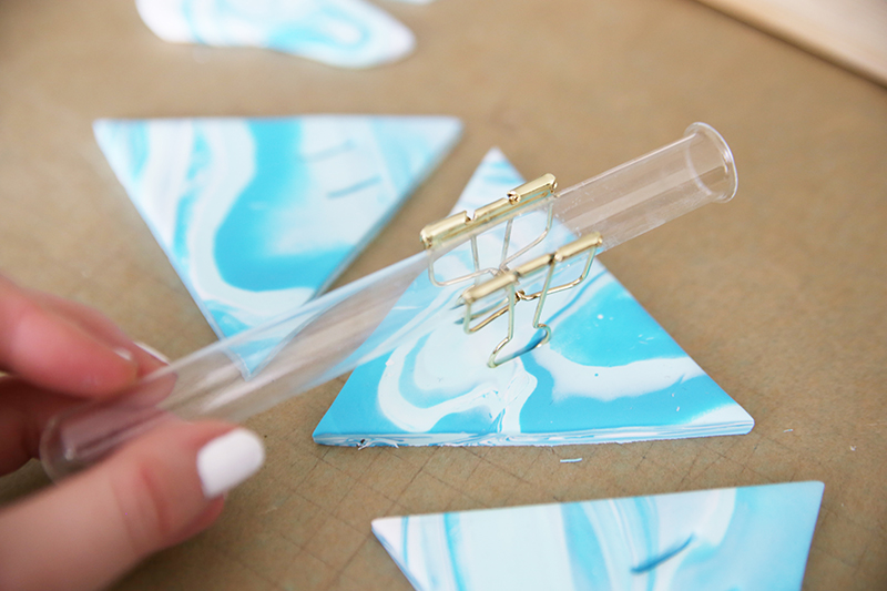 5. Backe die Dreiecke bei 130 Grad für 15 Minuten. Direkt wenn die Dreiecke aus dem Ofen kommen, drückst du die Klammern in die Schlitze. Hier ist eigentlich kein Klebstoff mehr nötig, die Klammern halten von ganz alleine. Wenn das bei dir nicht der Fall ist, setze jeweils einen Klebepunkt aus Heißkleber an den Enden, wo sie im Fimo stecken.