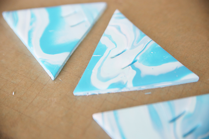 3. Schneide aus dem ausgerollten Fimo drei Dreiecke aus.