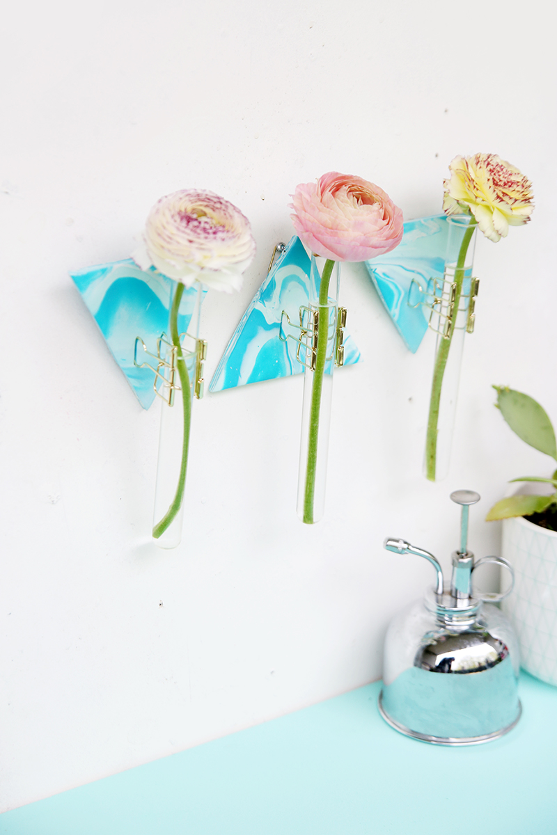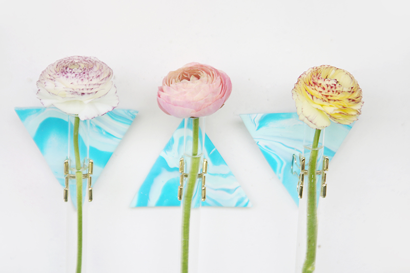 4. Befestige die Reagenzgläser an den Foldback-Klammern und drücke die Klammern fest ins Fimo. Du kannst sie dann wieder rausnehmen.