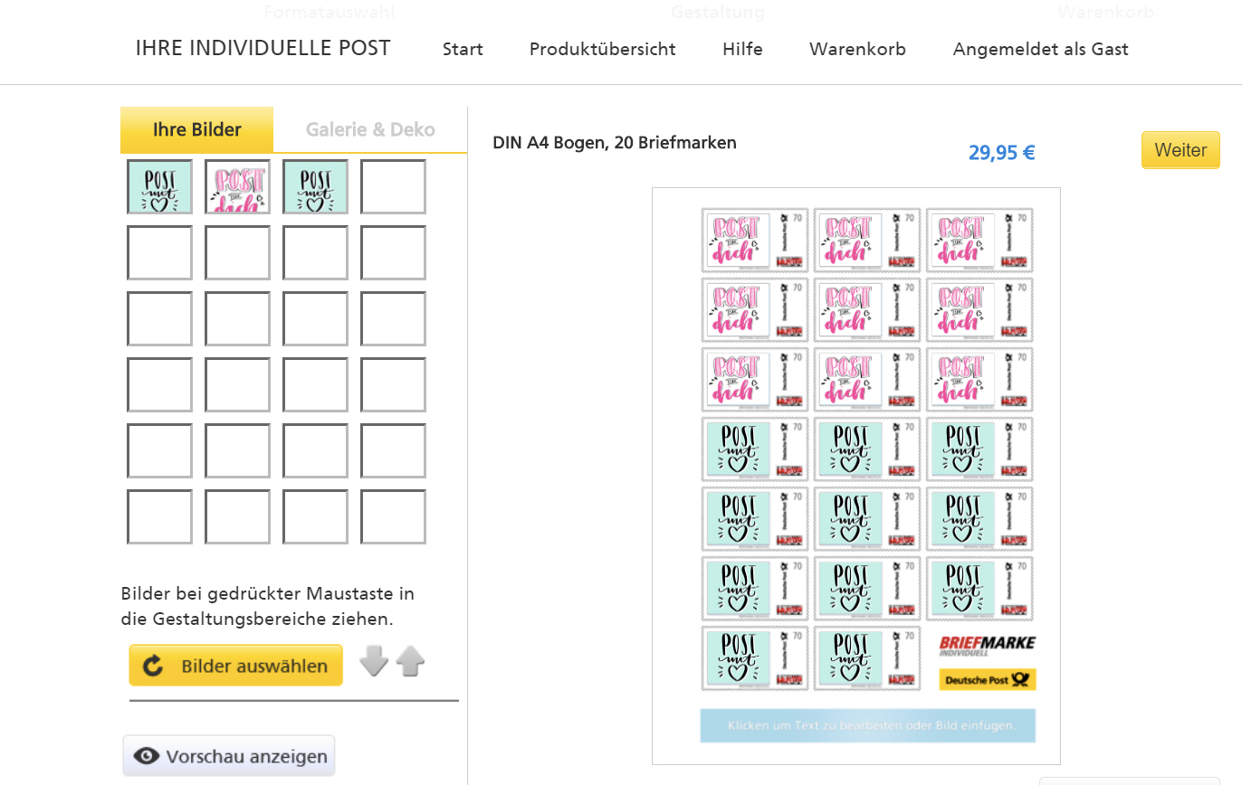 Du kannst auf dieser Seite eine Briefmarke Individuell der Deutschen Post gestalten, die dann an dich geschickt wird! Es gibt die Möglichkeit, Herzbriefmarken zu gestalten (so süß!) oder ganz klassische. Briefmarke Individuell ist bereits ab 8,95 € inkl. MwSt. für vier individuell gestaltete Herzbriefmarken bzw. 29,95 € für 20 klassische, individuell gestaltbare Briefmarken verfügbar. 🙂