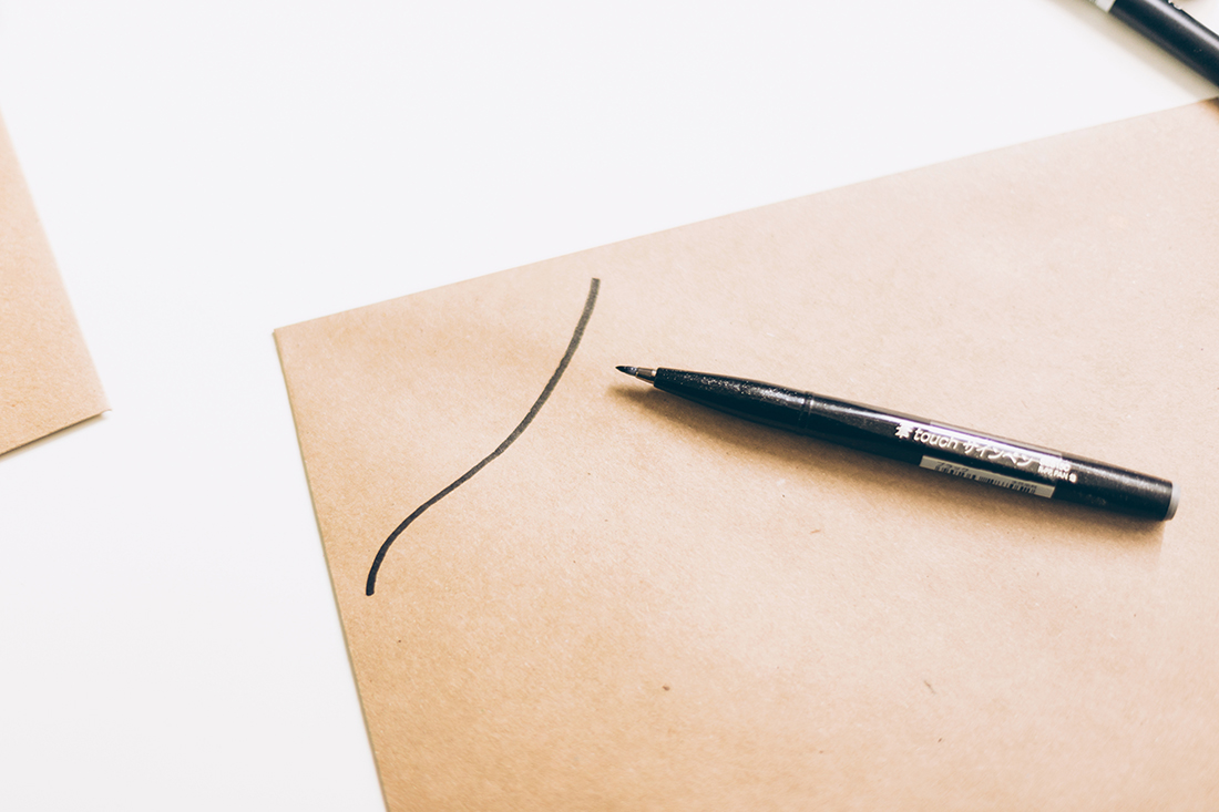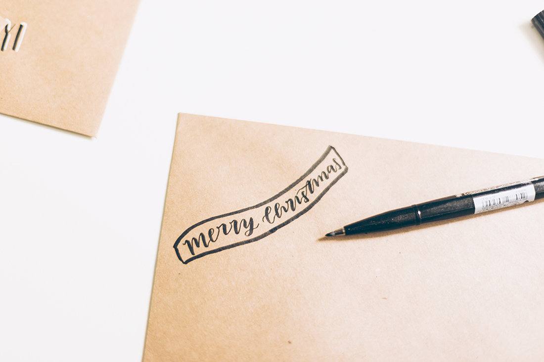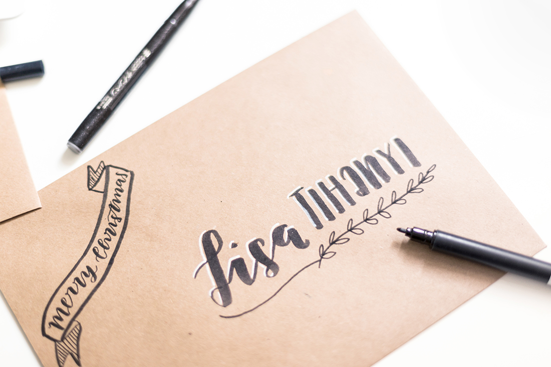 1. Du kannst deine DIY Weihnachtskuverts ganz so gestalten, wie du Lust hast – ich schreibe in der Regel die Absenderadresse auf die Rückseite, damit ich vorne freie Hand und Gestaltungsspielraum habe. Da, wo eigentlich die Absenderadresse wäre, kommt ein kleiner weihnachtlicher Banner hin. Dafür zeichne ich mit dem Pentel zuerst eine gebogene Linie: