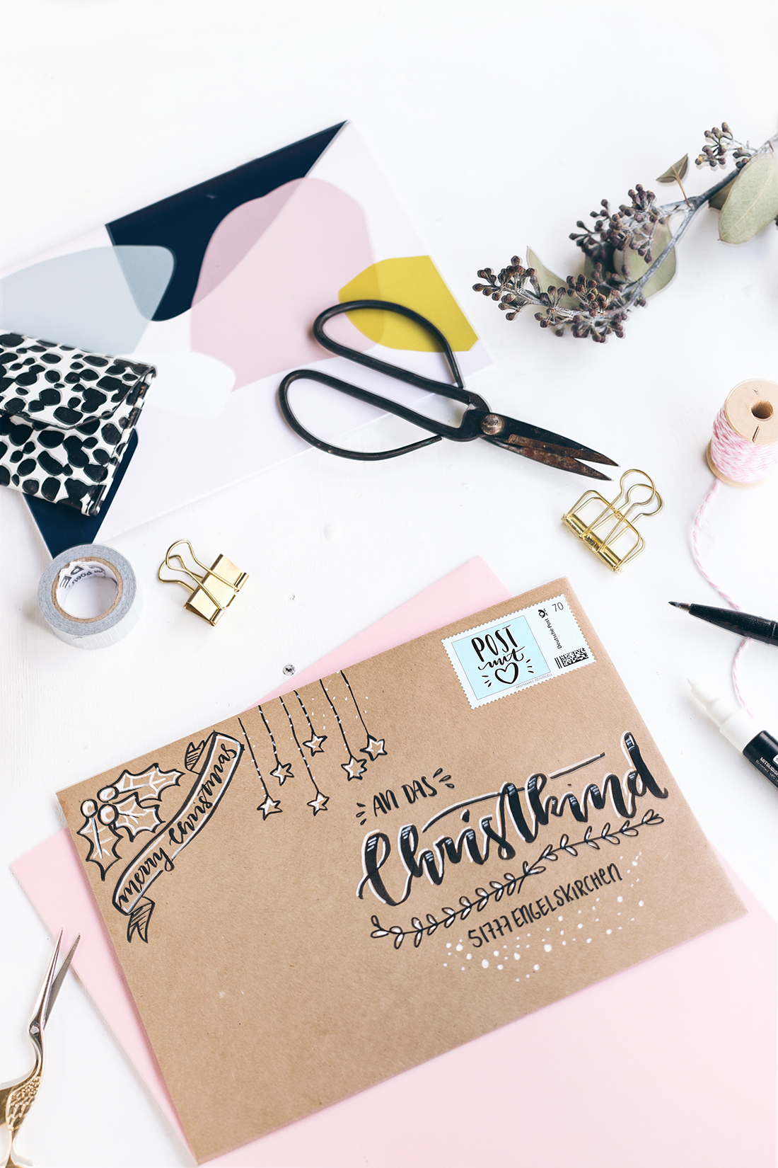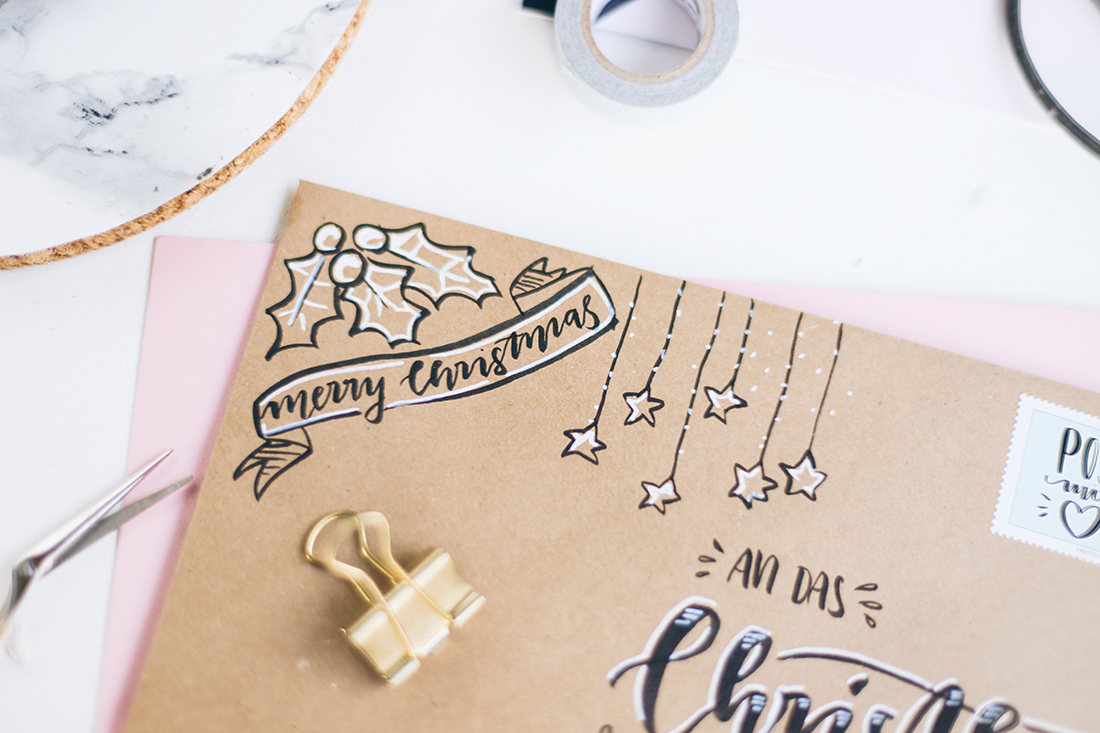 Außerdem kamen noch Stern-Girlanden dazu – so wird dein Umschlag mit ganz einfachen Mitteln so richtig kunstvoll – allein die zwei Farben machen schon sooo viel her, finde ich. Mit dem weißen Marker kann man wunderbar auch ein Schneegestöber um die Adresse malen: