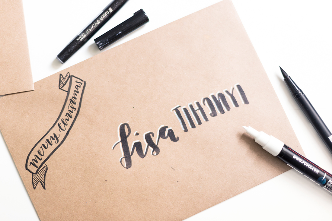 Nun kommt der Grund, warum wir Kraftpapier-Umschläge verwenden: Hier kannst du nämlich ganz großartig Highlights und „Schatten“ in Weiß setzen. Hierfür eignet sich der Posca-Marker, den ich oben verlinkt habe, wunderbar, weil er so gut deckt. Bei deinen Schriftzügen suchst du dir einfach eine Seite – links oder rechts – aus und ziehst dort die Linien nach – hier habe ich die Linien auf der linken Seite mit Weiß nachgezogen, so entsteht ein Schatten-Effekt.