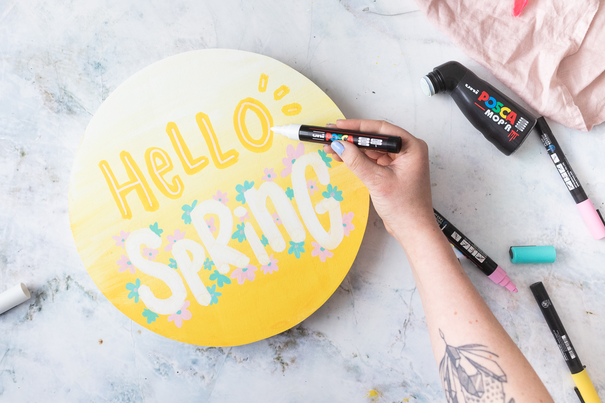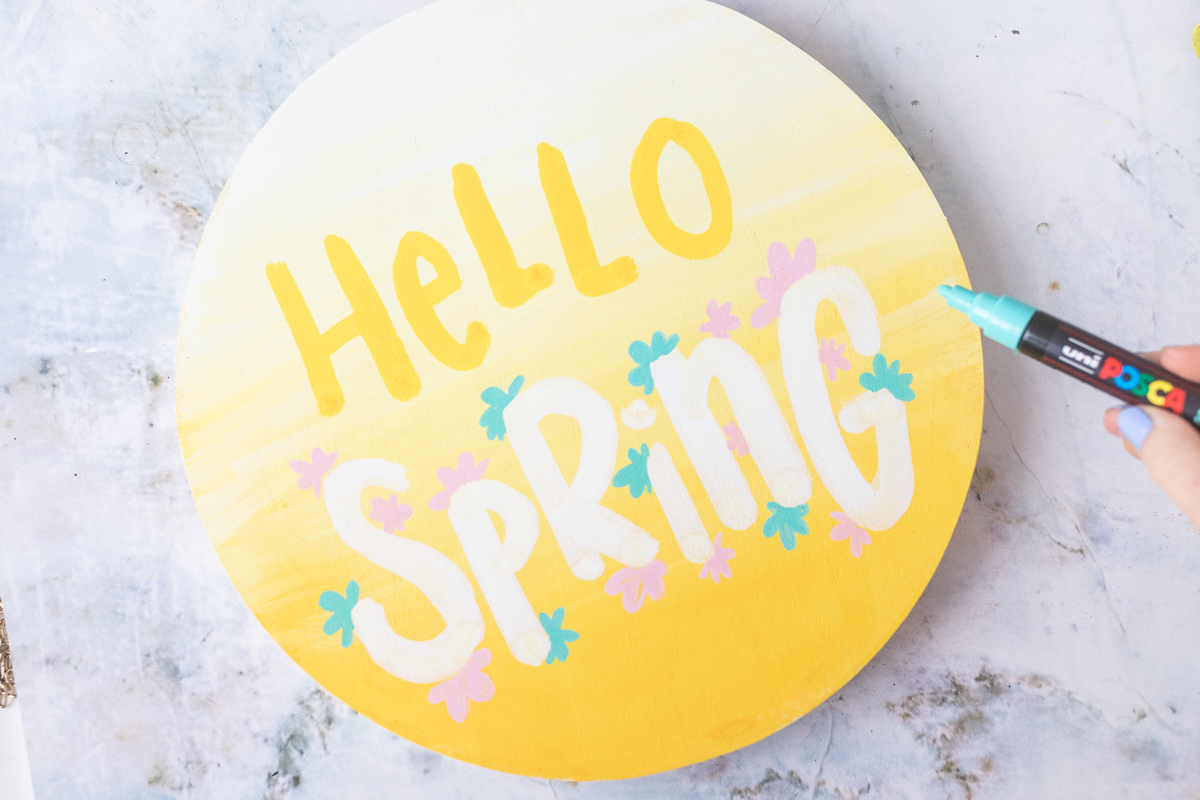 Mit den POSCA-Markern in Hellrosa und Aqua Grün malst du dann kleine Blüten rund um die „Spring“-Schrift. Achte dabei darauf, dass die Blüten nicht in die Schrift hinein ragen, sondern sie einrahmen.