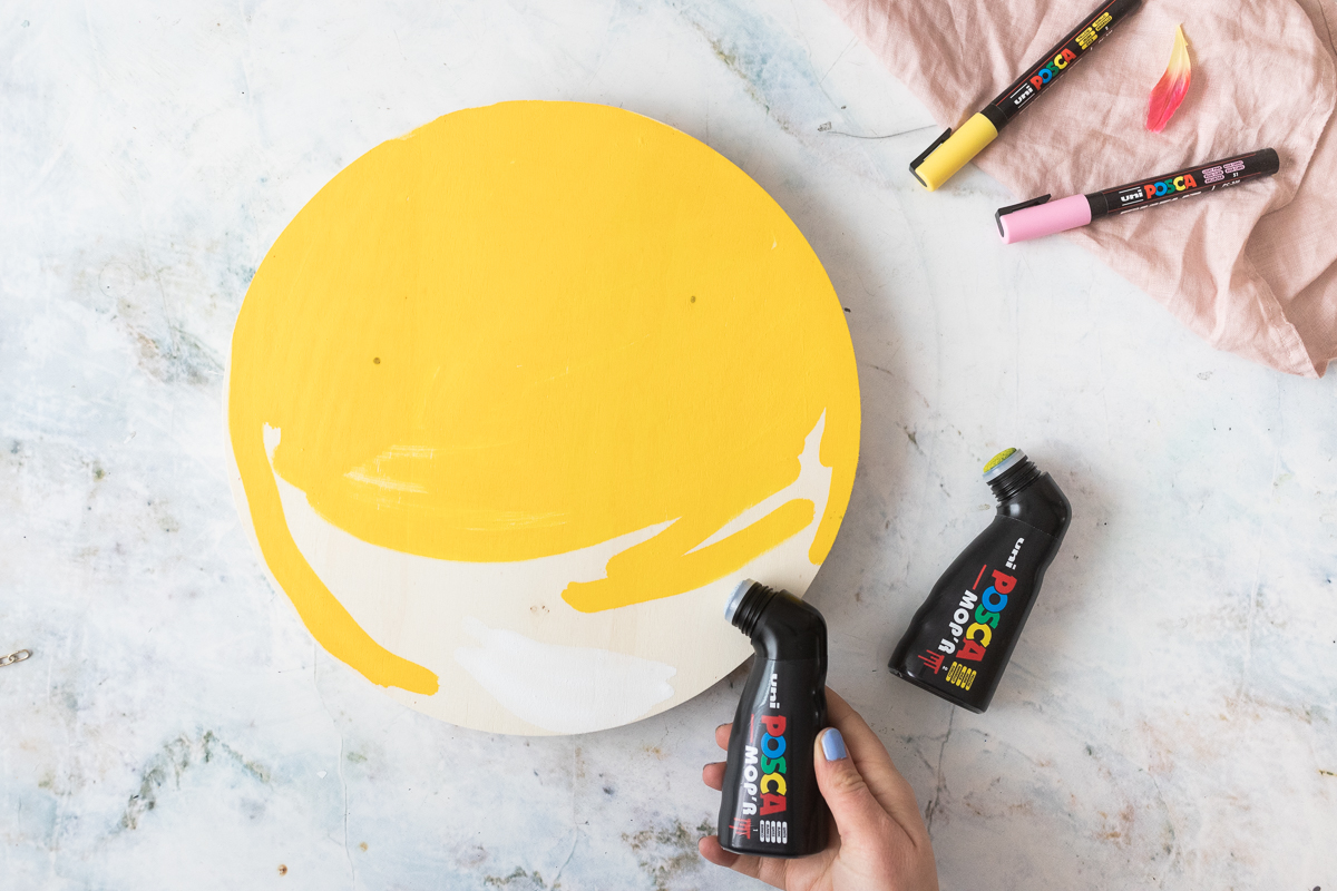 2. Für den Farbverlauf brauchst du den MOP’R in Weiß und Gelb. Zwei Drittel des Tabletts habe ich flächig in Gelb bemalt. Ein Drittel des Tabletts habe ich flächig in Weiß bemalt.