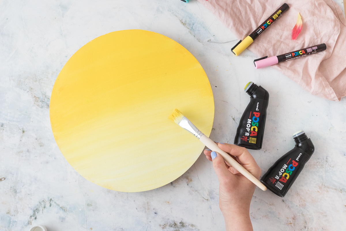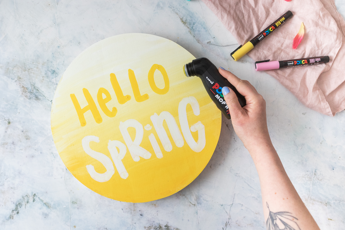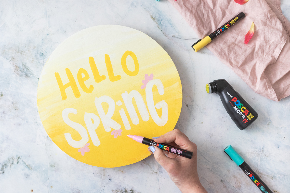 Passend zum April-Thema „Frühlingsgruß“ habe ich mir ein Holztablett geschnappt und mit den POSCA-Markern ein fröhlich-buntes Willkommensschild daraus gemacht, um den Frühling und alle Gäste willkommen zu heißen.