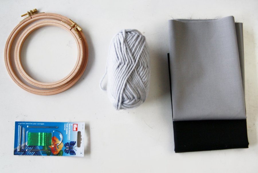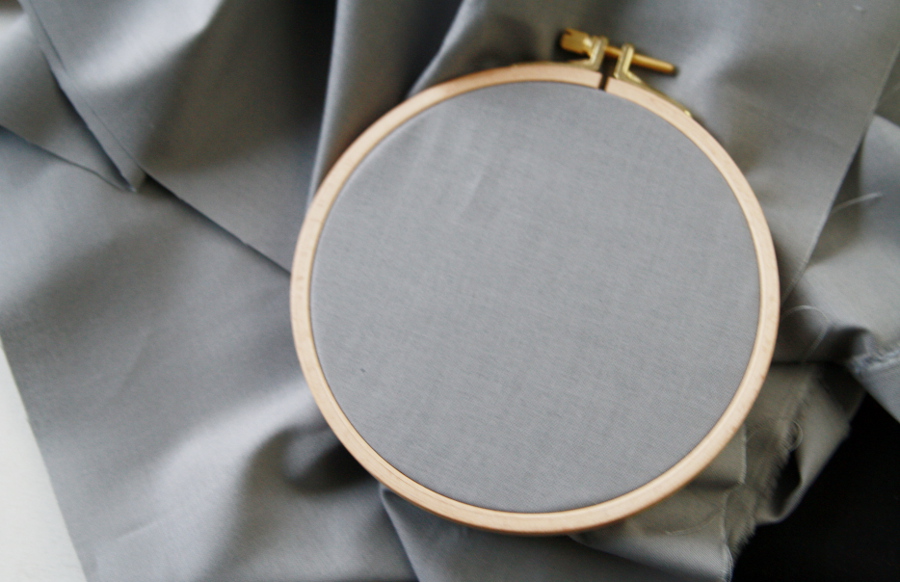 1. Spannt zunächst den Stoff in euren Stickrahmen. Dafür müsst ihr lediglich die Schraube eures Stickrahmens aufdrehen, den kleineren Ring rausnehmen und den Stoff aufspannen.