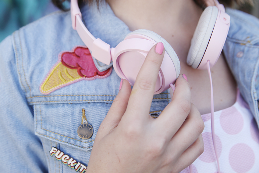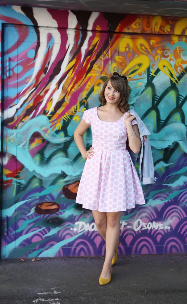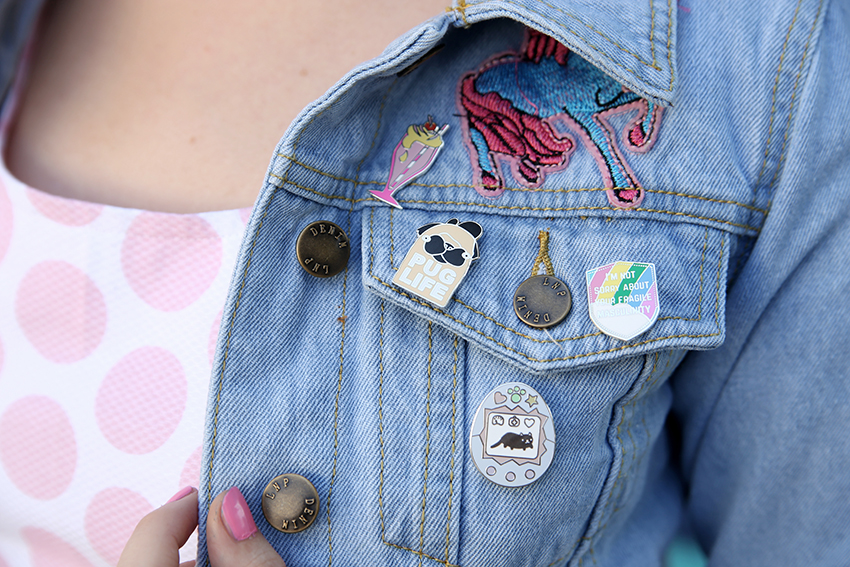 Der Mann war der Meinung, dass das Kleid insgesamt bisschen landei-ig rüberkommt. Deshalb hab‘ ich die Landeiigkeit für die Fotos durch meine fesche Jeansjacke ein wenig entkräftet. Mit extrem coolen Pins, unter anderem von hand over your fairy cakes (daher sind die feministischen Exemplare) und von Asos – unter anderem der süße Mops-Pin von Asos*! Man kann nie genug Mops-Pins haben. Jetzt ist das Outfit das Gegenteil von ländlich und hat eher stattdessen einen schicken Retro-Touch. Die Jeansjacke ist ebenfalls von Asos*!