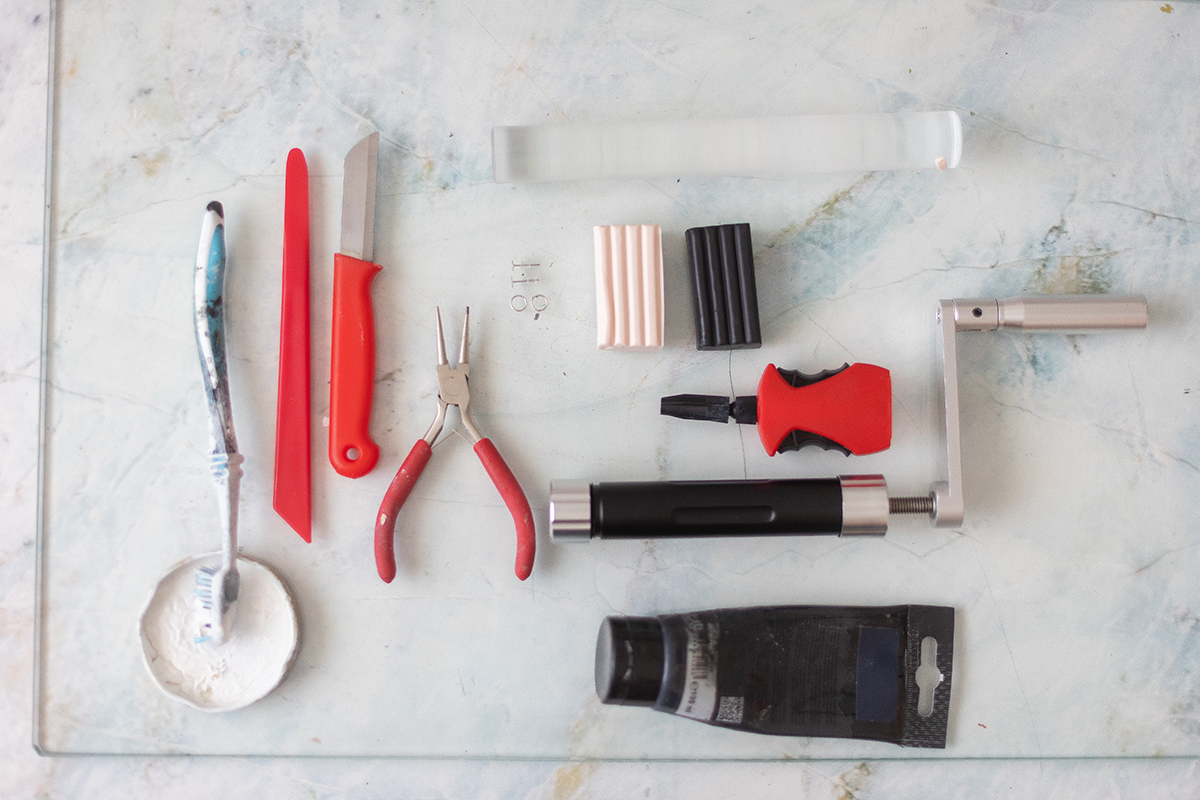 - FIMO in verschiedenen Farben (Rosa, Schwarz) – pro Ohrring reicht weniger als 1/2 Block FIMO