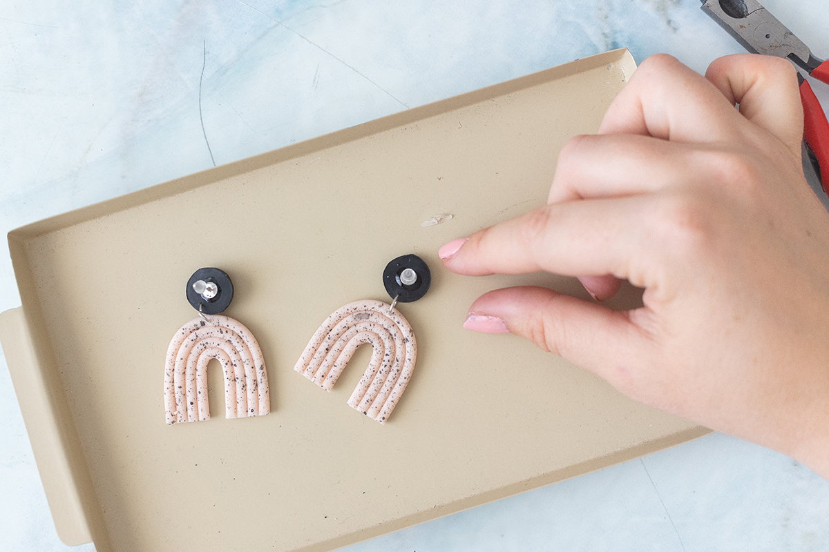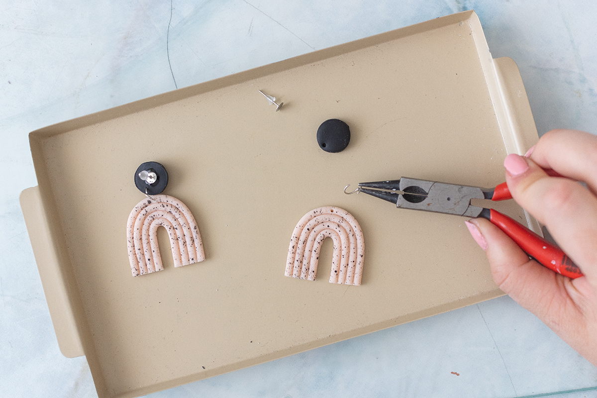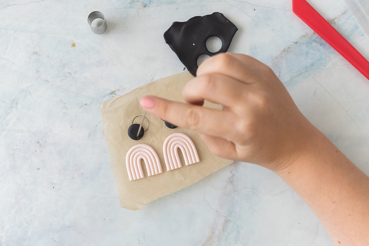 Jetzt kommen die Ohrringe bei 110 Grad für 30 Minuten in den Backofen zum Aushärten. Wenn die Ohrringe ausgehärtet sind, lass sie einen Moment abkühlen, bevor du weiter arbeitest.