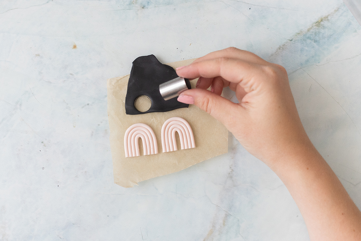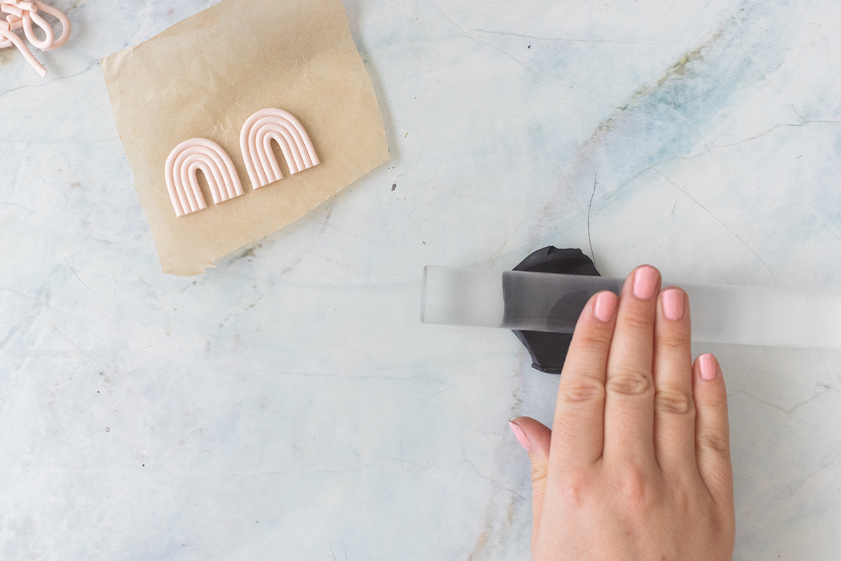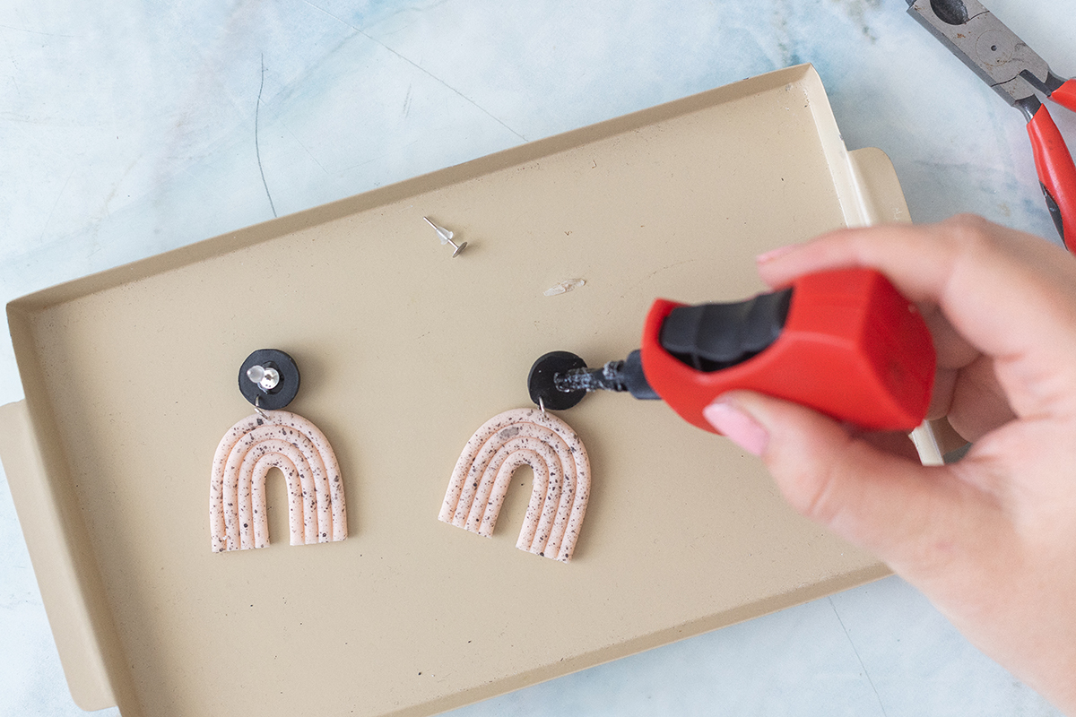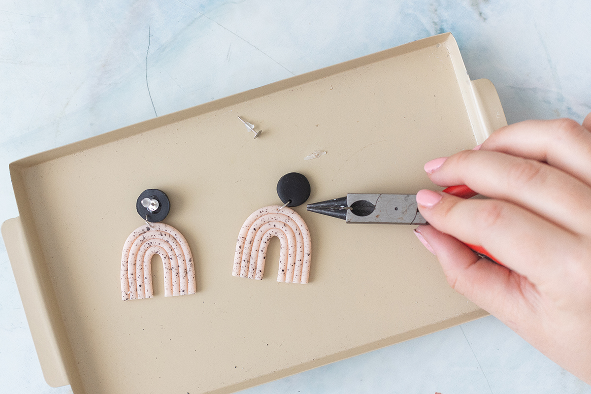 Jetzt kommen die Ohrringe bei 110 Grad für 30 Minuten in den Backofen zum Aushärten. Wenn die Ohrringe ausgehärtet sind, lass sie einen Moment abkühlen, bevor du weiter arbeitest.