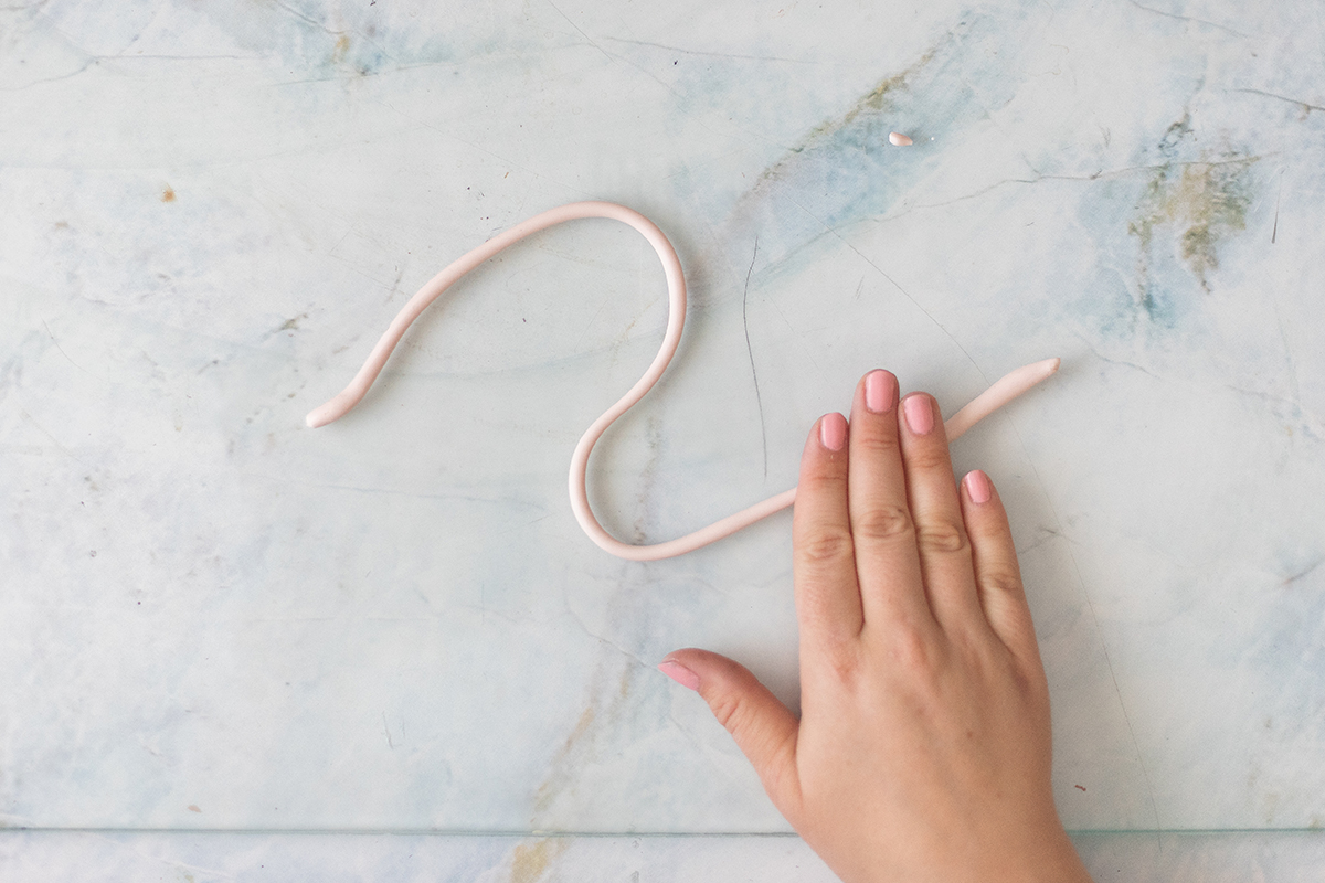 1. Im ersten Schritt werden die rosa Stränge FIMO ausgerollt. Rolle die Stränge gleichmäßig aus, sodass sie ca. 4mm dick sind. Damit die Stränge gleichmäßig werden, gibt es zwei Möglichkeiten: