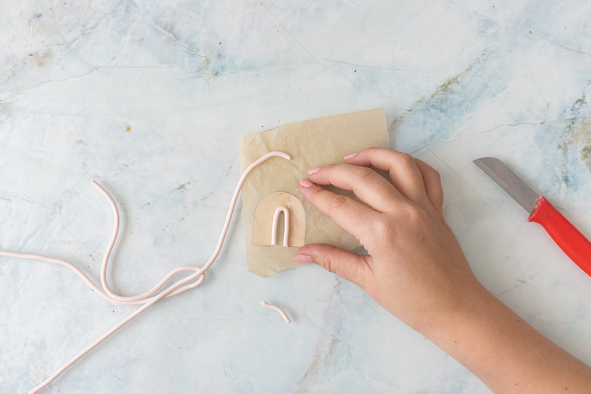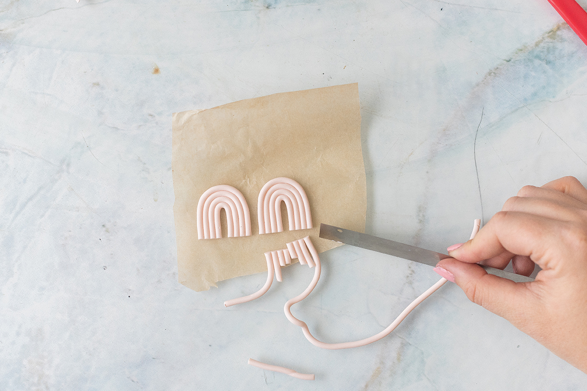 2. Pro Ohrring werden 4 Stränge benötigt. Drücke nun die vier Stränge aneinander und forme eine Regenbogen-Form aus den FIMO-Strängen – drücke dabei die Stränge gut zusammen, sodass sie aneinander haften. Dabei helfen Modellierwerkzeuge, damit die Form schön wird und keine Fingerabdrücke auf dem FIMO entstehen.
