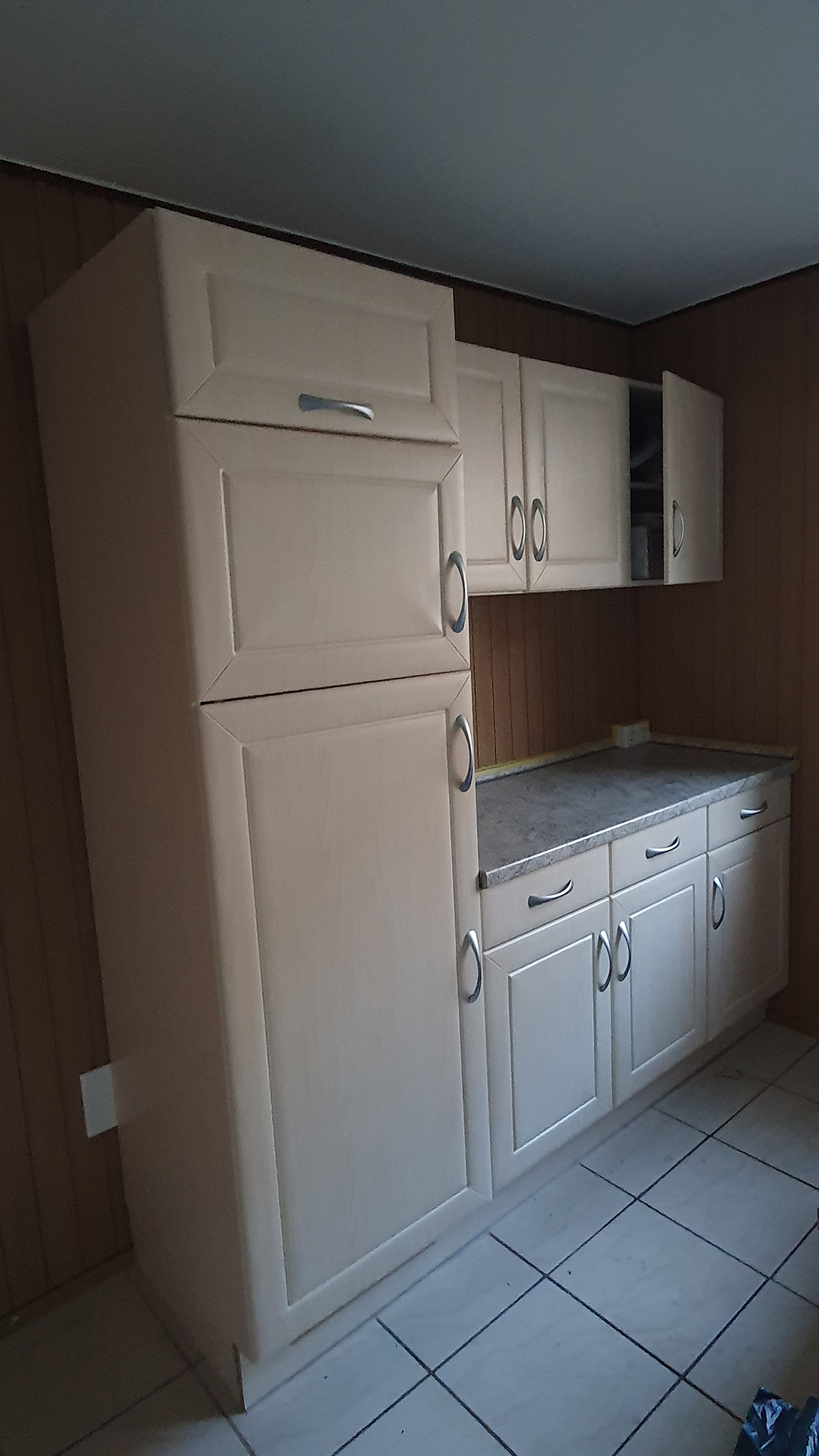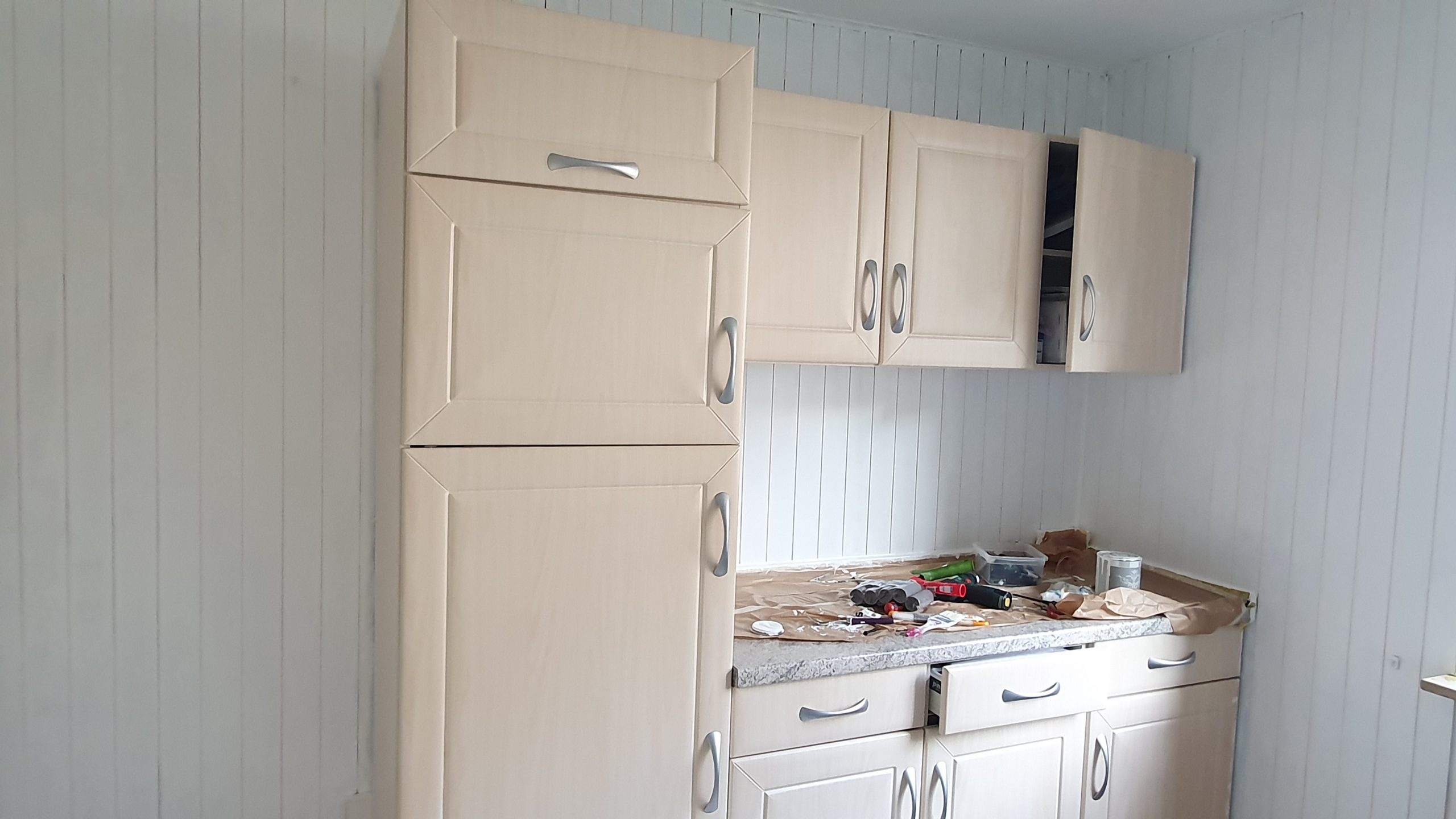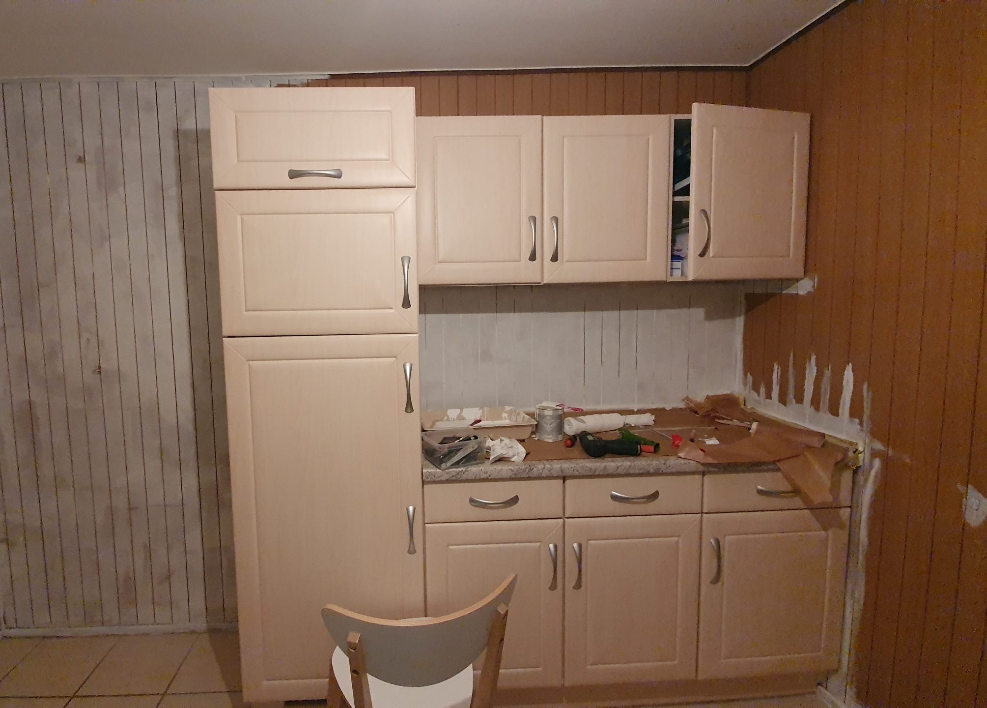 Dann ging es natürlich noch an die andere, linke Seite der Küche. Die große Herausforderung: die braune Holzwand!