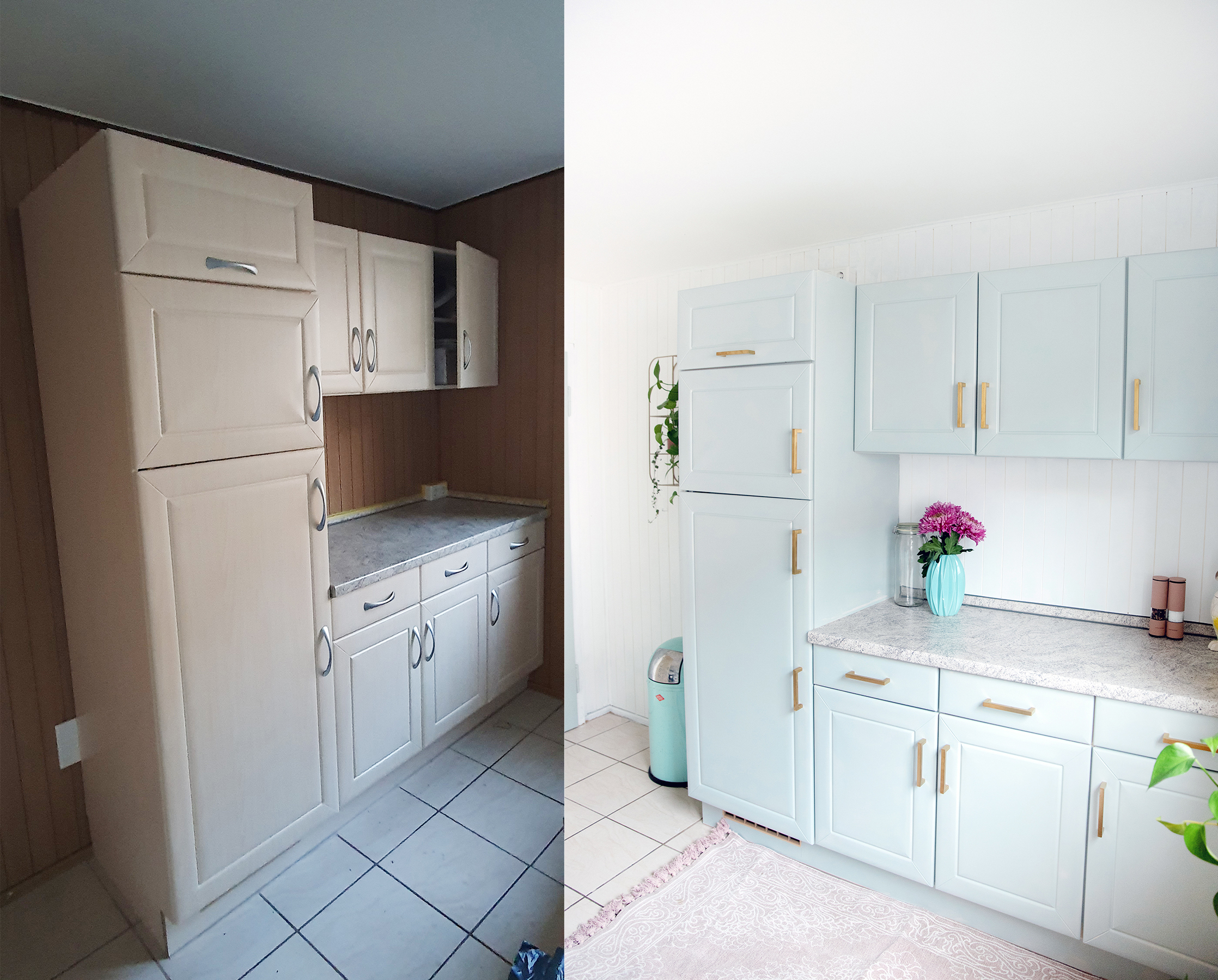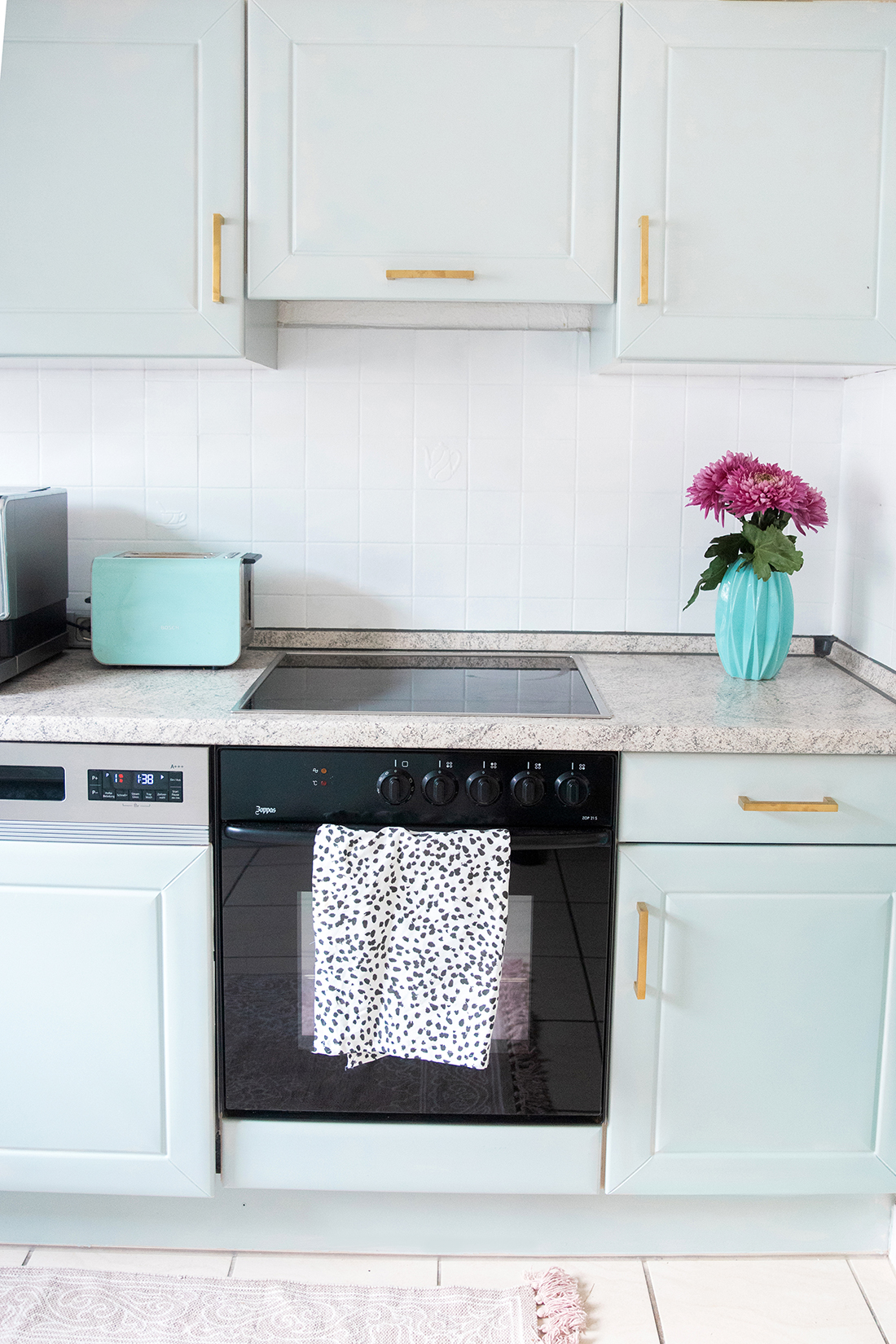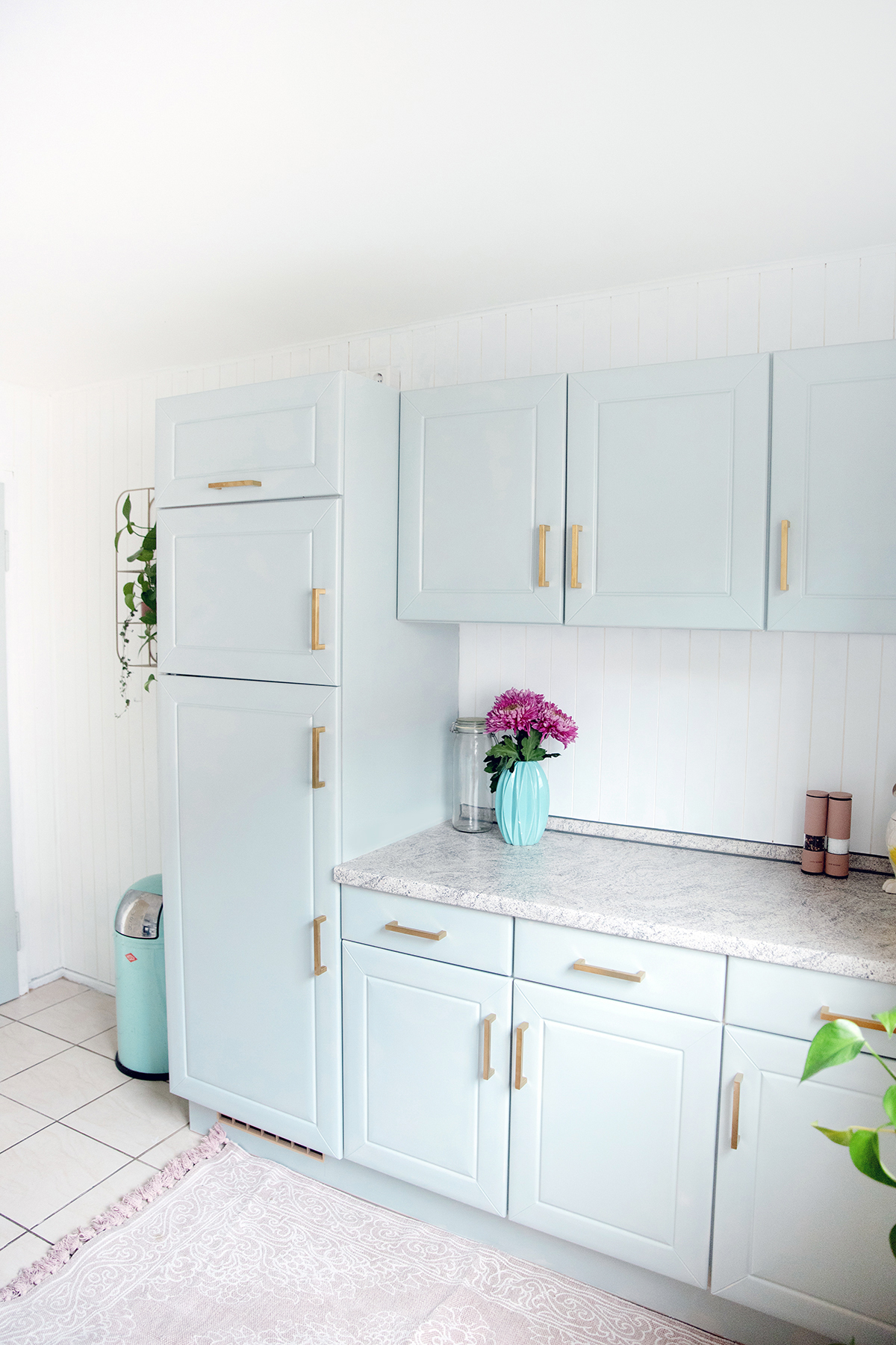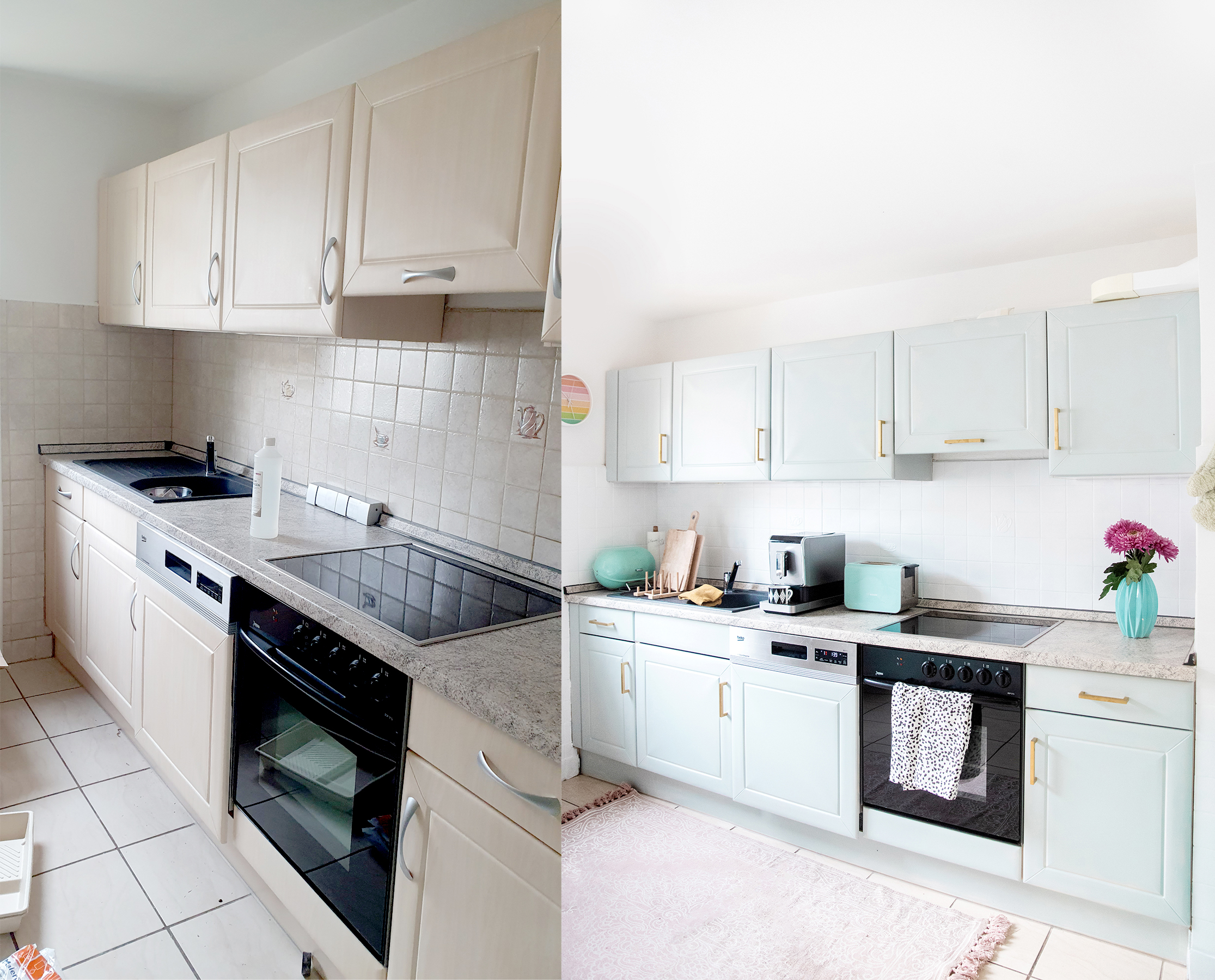 Vom Ergebnis bin ich absolut begeistert – schaut euch bitte das wunderschöne weiße Holz, die mint-blauen Fronten zusammen mit den edlen goldenen Griffen an – diese Küche hat rein gar nichts mehr damit zu tun, wie sie mal aussah!