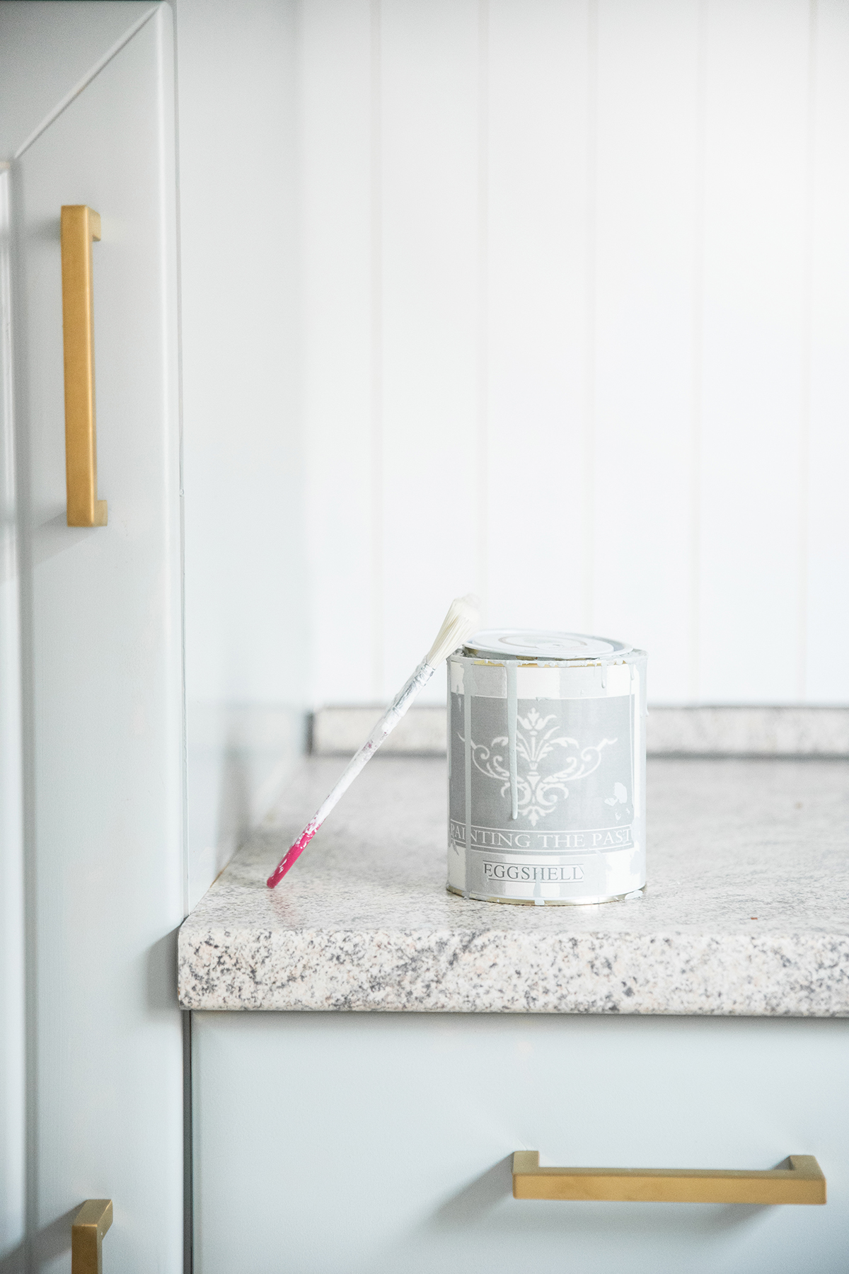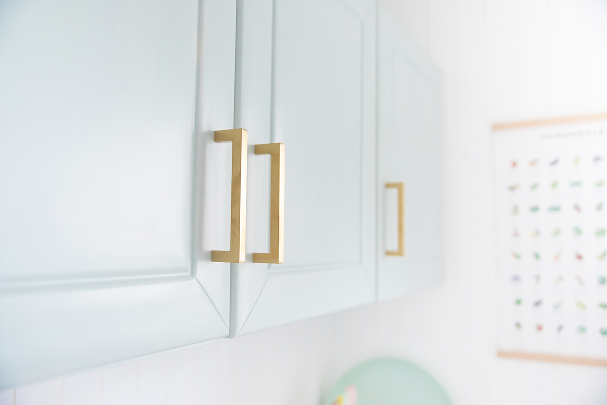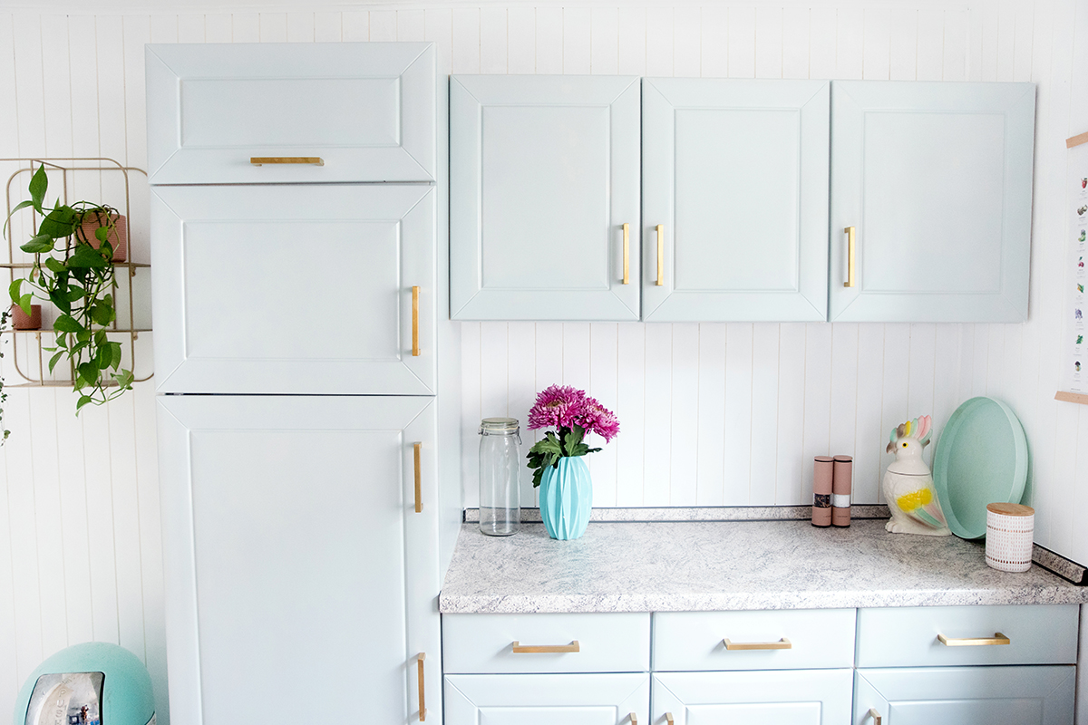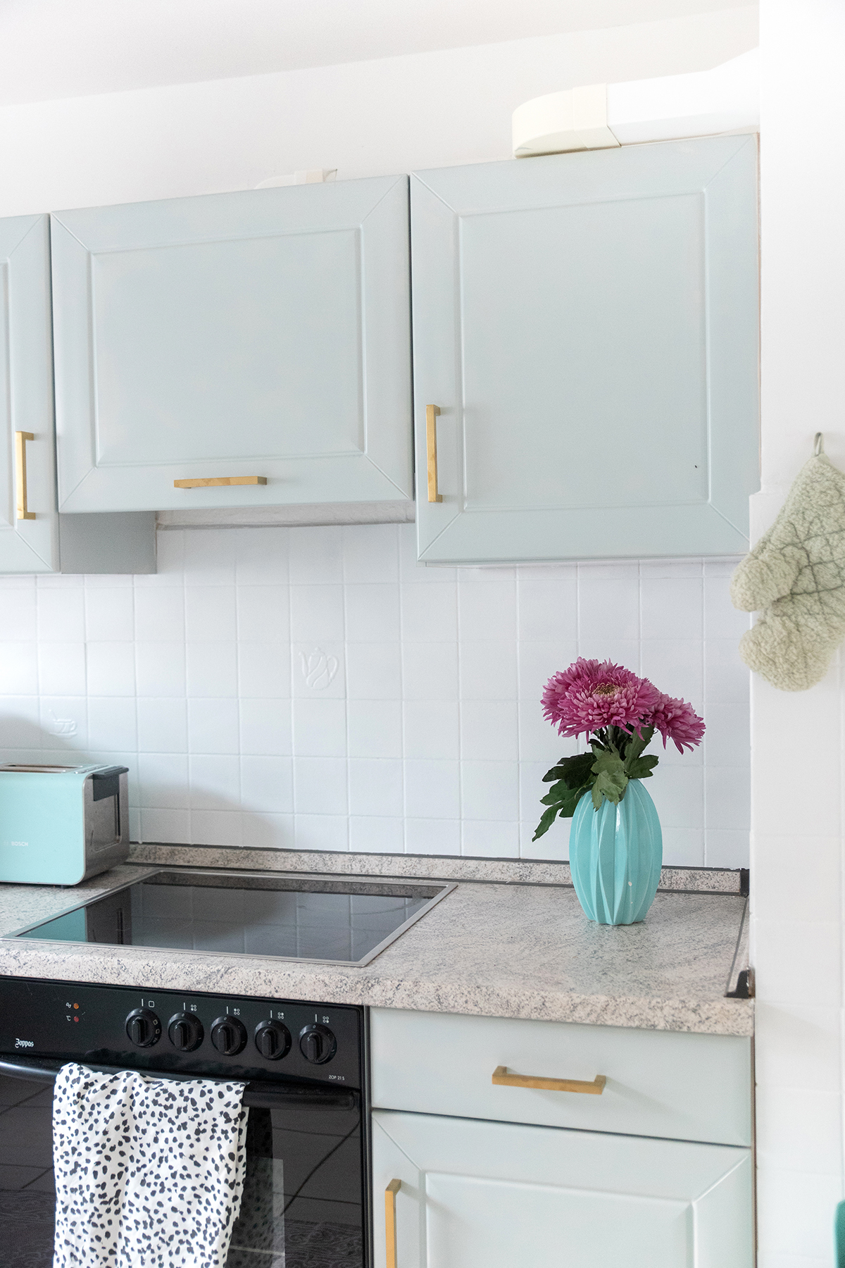 Vom Ergebnis bin ich absolut begeistert – schaut euch bitte das wunderschöne weiße Holz, die mint-blauen Fronten zusammen mit den edlen goldenen Griffen an – diese Küche hat rein gar nichts mehr damit zu tun, wie sie mal aussah!