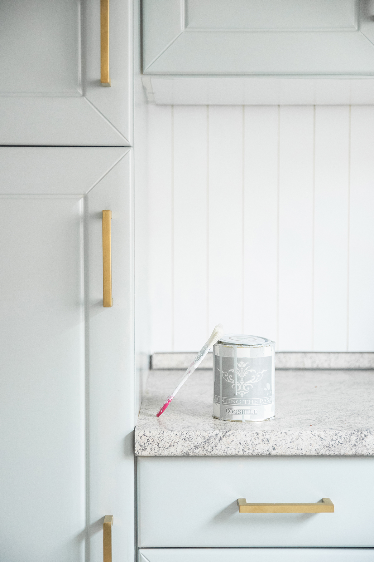 Auch die Küchenfonten haben wir zuerst gut gereinigt. Hier habe ich zum Streichen die Kreidefarbe „Painting the Past“ in Sage von Miss Pompadour verwendet. Das Tolle daran: Es ist Kreidefarbe, das heißt, man die Küche streichen OHNE Schleifen – einfach drüber streichen!