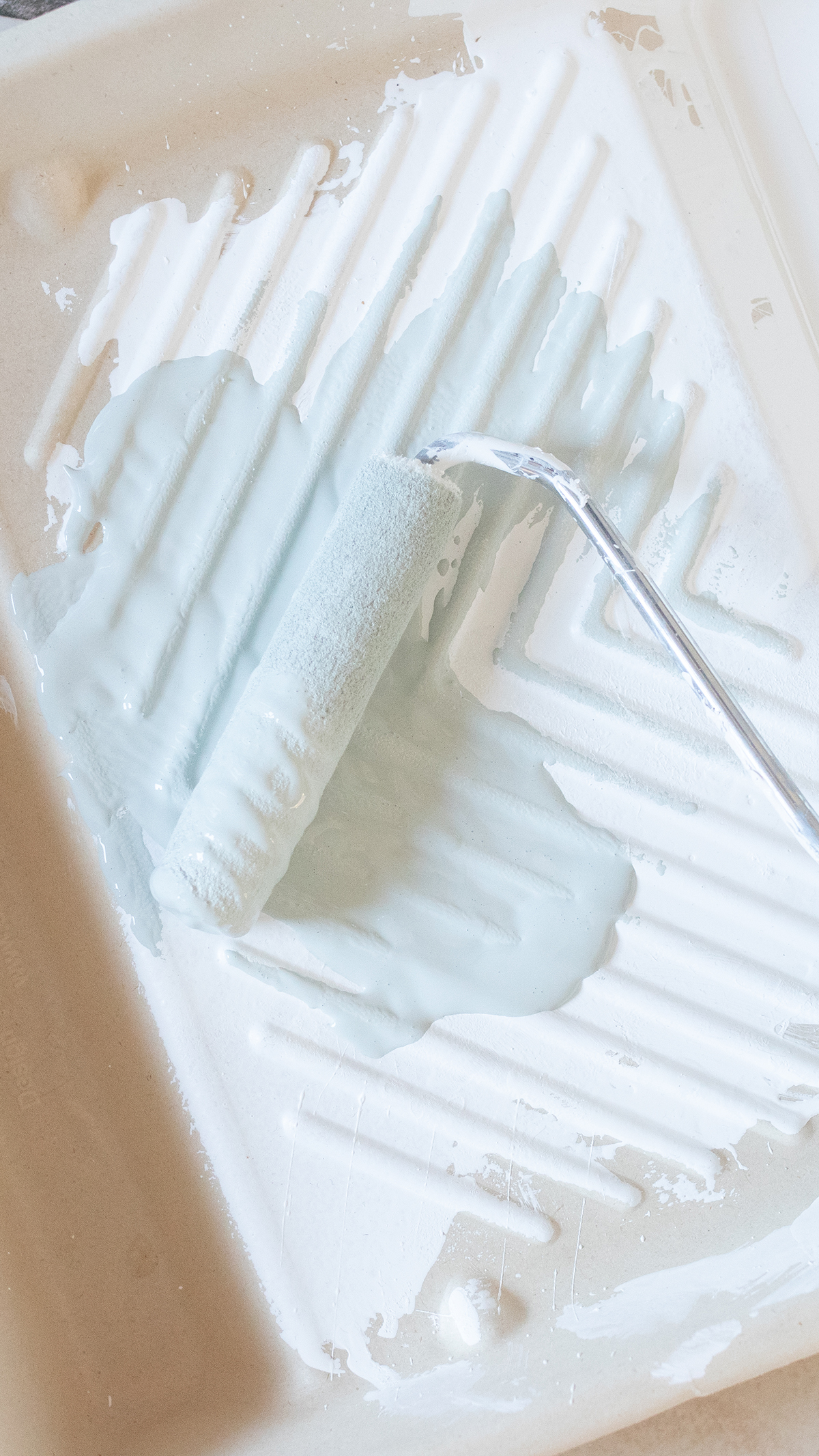 Im nächsten Schritt haben wir die erste Schicht der Fliesenfarbe aufgetragen – auch wieder mit Farbrollen. Hier empfiehlt es sich, mit einem Pinsel zuerst die Fugen auszumalen und dann mit Farbrollen flächig drüber zu gehen.