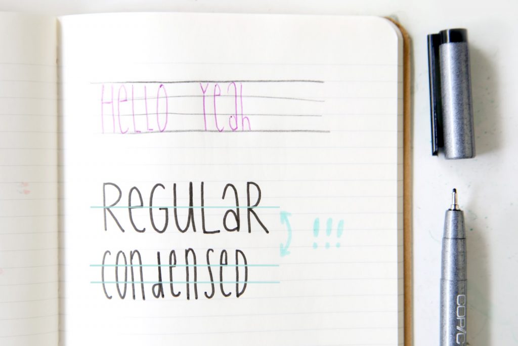 Ich hab die perfekte Übung für diesen verregneten Sonntag für euch! Denn bei vielen Fragen, die mich erreichen, geht es um meine Schriften beim Hand Lettering. Eine Technik, wie ihr Faux Calligraphy (also Pseudo-Kalligraphie ohne Feder!) selbst gestalten könnt, habe ich euch neulich schon gezeigt. Heute soll es um einen anderen Schrifttyp gehen, der bei mir oft Verwendung findet: nämliche handgeschriebene Condensed-Schriften. Von mir auch als „Quetschi“-Schrifttyp bezeichnet.
