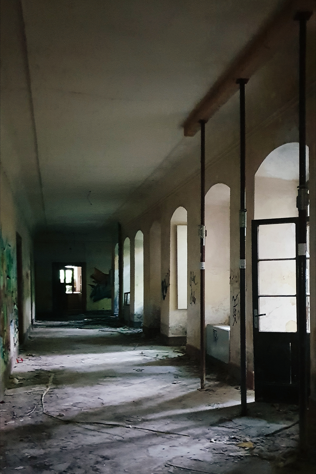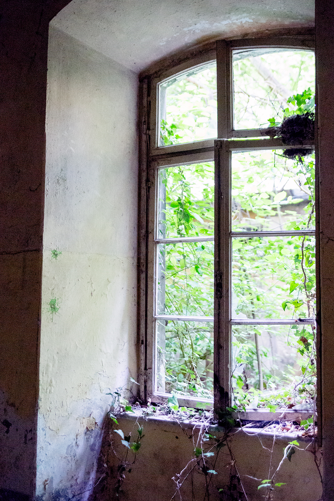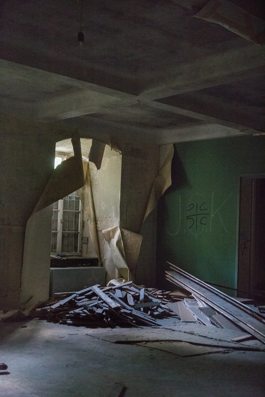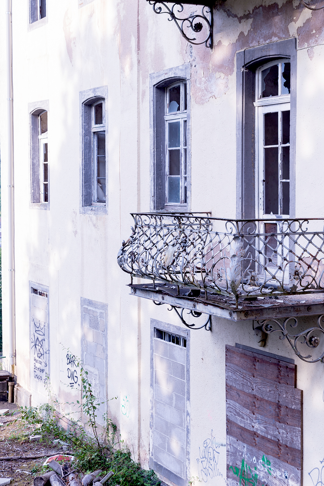 Schon wenn man sich von außen dem Gebäude nähert, sieht man einige kaputte Fenster. Wir haben noch gescherzt „Wär echt gruselig, wenn man danach so auf den Fotos eine Gestalt am Fenster sehen würde.“ Äh, ist nicht passiert, zum Glück.