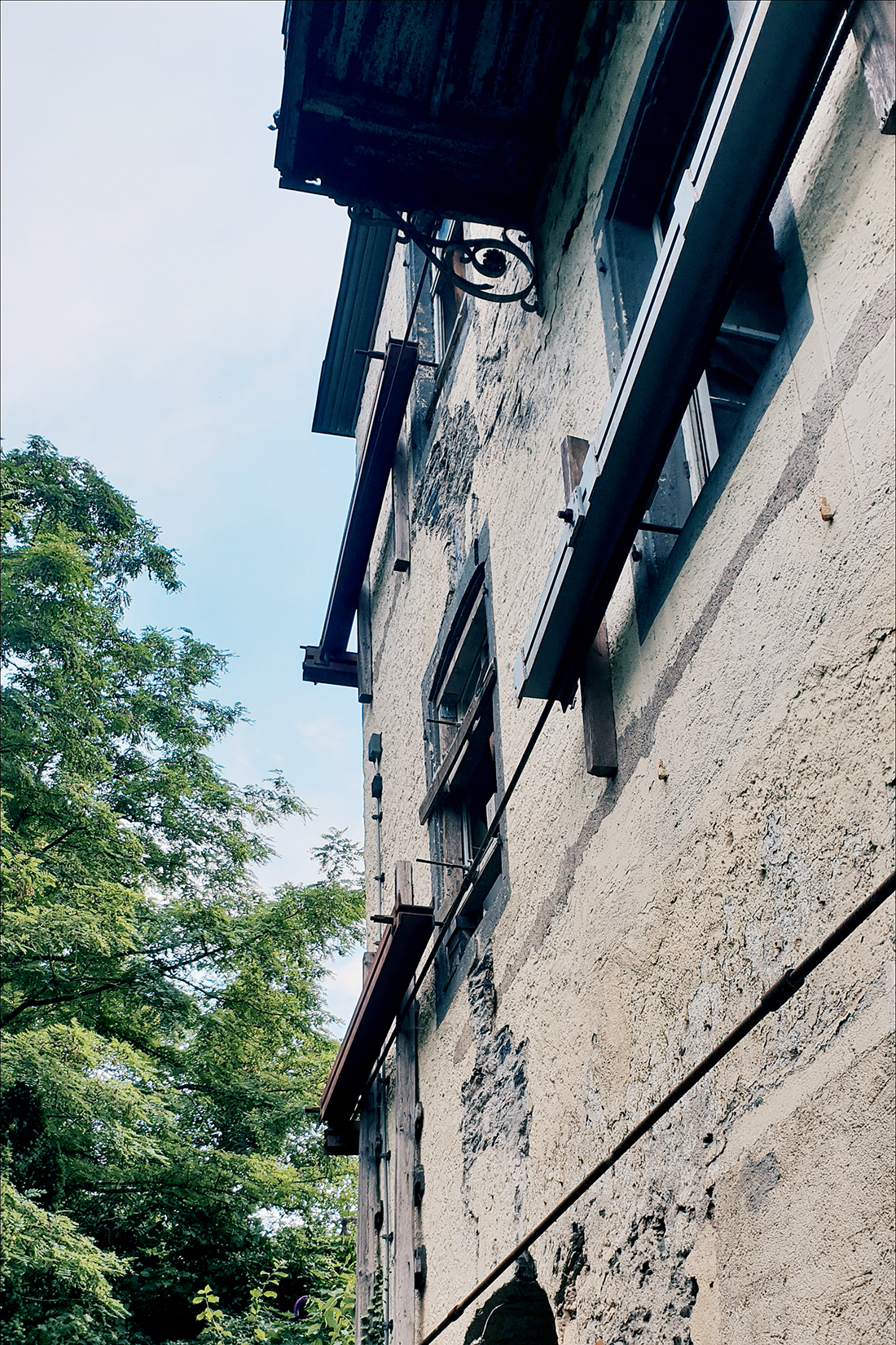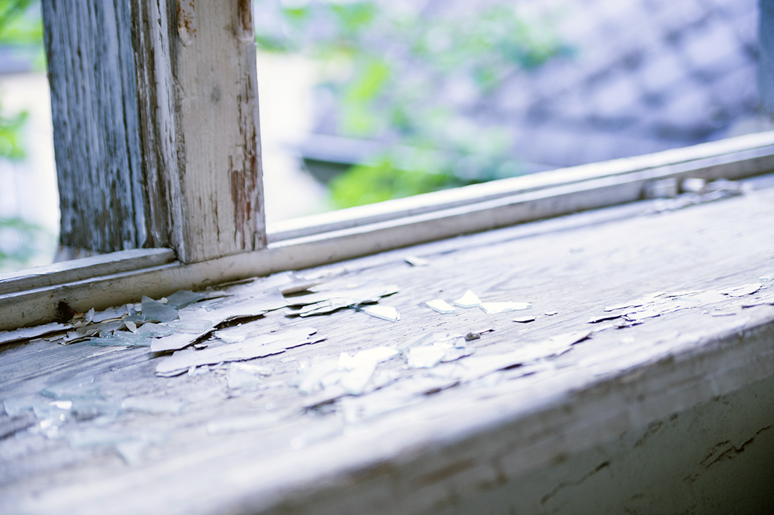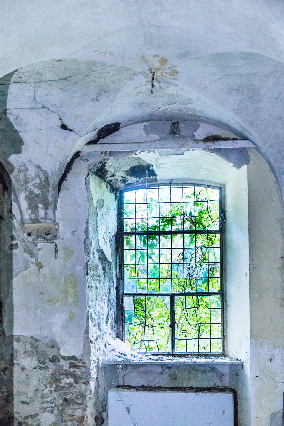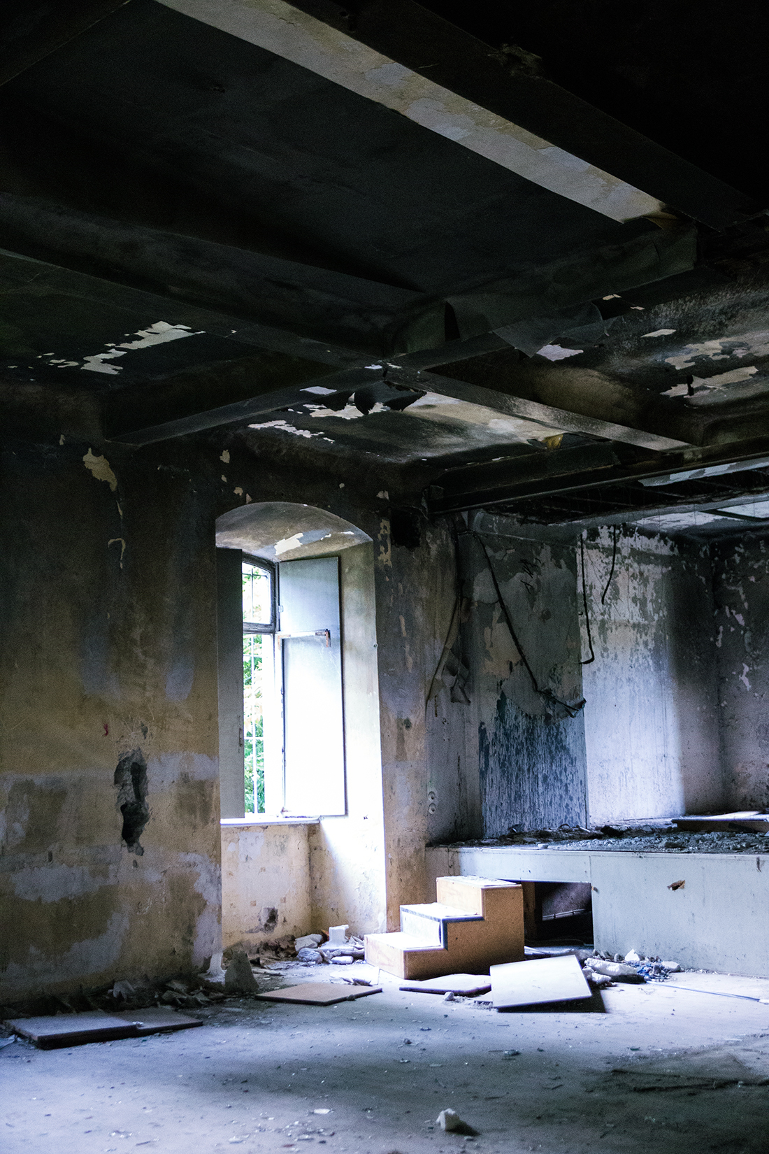 Schon wenn man sich von außen dem Gebäude nähert, sieht man einige kaputte Fenster. Wir haben noch gescherzt „Wär echt gruselig, wenn man danach so auf den Fotos eine Gestalt am Fenster sehen würde.“ Äh, ist nicht passiert, zum Glück.