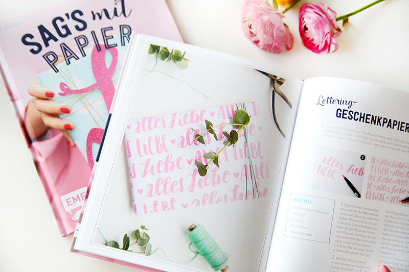 Tipps fürs Handlettering gibt es übrigens noch obendrauf – eine meiner Ideen in meinem Buch ist schön verziertes Geschenkpapier mit stylischem Lettering in verschiedenen Schriften. Ich liebe die schlichte Kombi mit weißem Geschenkpapier und etwas Eukalyptus als Deko.