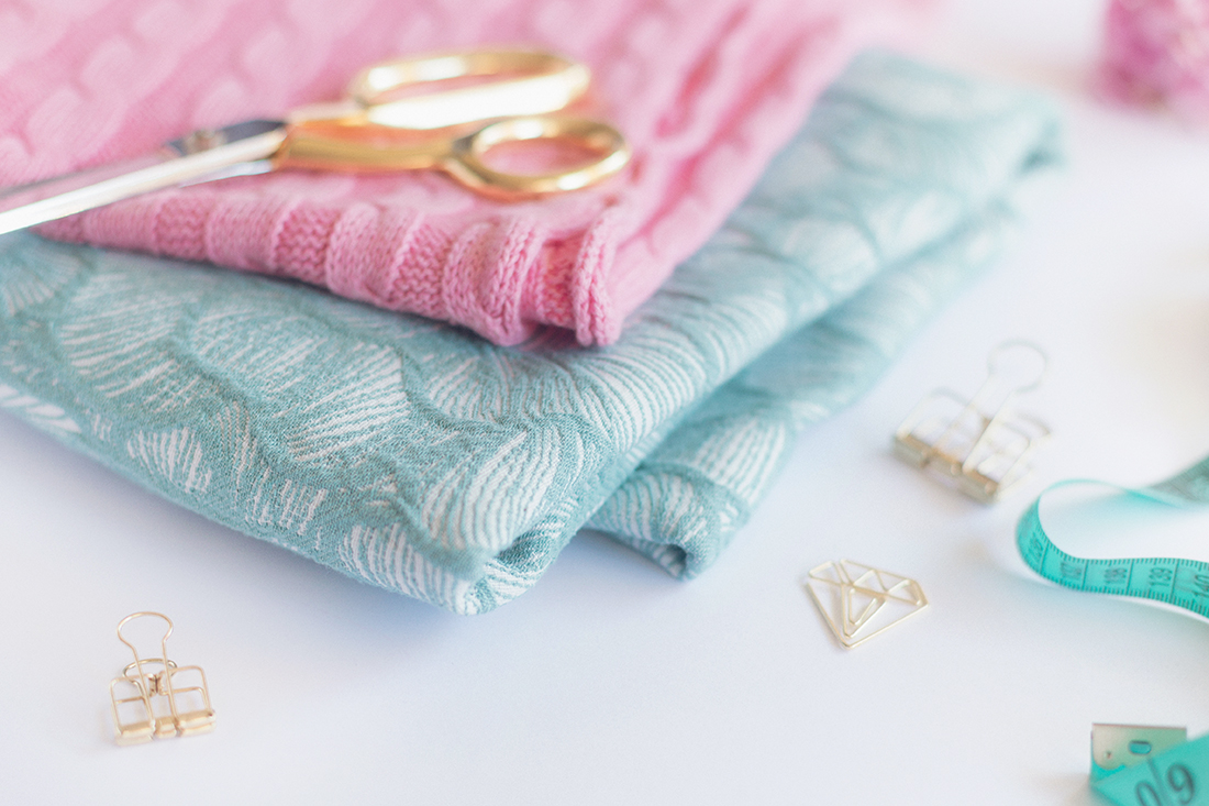Beide Stoffe habe ich von alles-fuer-selbermacher. Den Jacquard könnt ihr hier nachkaufen. Den Strickstoff gibt es leider gerade nicht mehr (nur noch in Smaragdgrün).